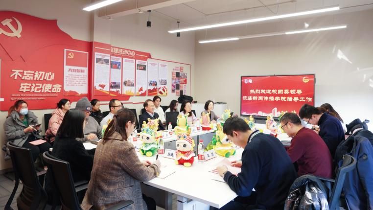 1月25日下午,beat365英国官方网站团委书记王鸿栋,创新创业学院副院长王驰,校团委副书记姜晓庆、富旭一行赴新闻传播学院调研指导共青团工作。新闻传播学院党委书记王晴川,党委副书记、副院长王智君,挂职副院长、智能传播系主任王虎,团委副书记、副教授易红发,青年教师代表张林,团委书记赵琳,团委副书记朱珈仪、薛堯云及学生代表共同参与。调研会议在延长校区智能媒体实验中心413会议室举行。学院团委书记赵琳主持会议。