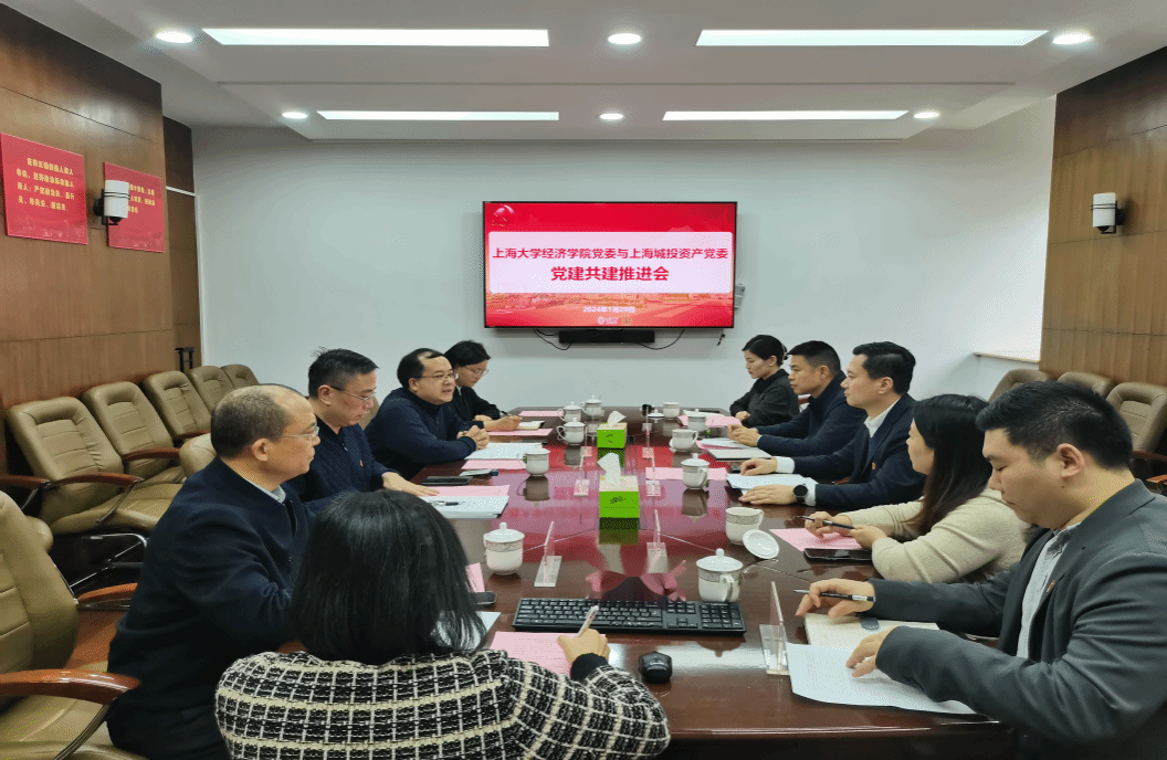 2024年1月29日下午,上海城投资产管理(集团)有限公司一行至beat365英国官方网站经济学院开展党建共建工作交流研讨。上海城投资产党委书记、董事长黄建刚,党委副书记严育新,党委组织部(人力资源部)部长杨慧慧,党委组织部(人力资源部)成柠茜,城投资产交流锻炼干部赵安康;经济学院党委书记孟添,党委副书记、副院长冯玉鑫,上海市软科学研究基地-上海科技金融研究所研究总监祝波,金融系教师、交流锻炼干部任桂,学院党委组织员范春艳参加本次会议。会议由冯玉鑫主持。