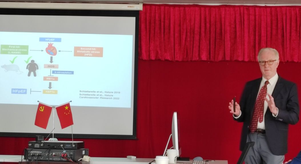 报告会上,Hill教授指出心血管疾病一直是全球最主要的致死因素,心血管疾病死亡人数的下降与科技的进步密切关系,但近年来由于肥胖、糖尿病、高血压、抽烟等因素诱发的动脉粥样硬化人数正逐渐增多,未来心血管疾病的防治面临更大的挑战。他介绍了自己课题组在心力衰竭方面的研究进展,巨噬细胞对心肌梗死后的炎症反应和心肌修复过程至关重要,cGAS-STING信号通路在心力衰竭中的作用,iNOS依赖的IRE1α-XBP1通路失调是诱导射血分数保留型心力衰竭中心肌细胞功能障碍的重要机制。