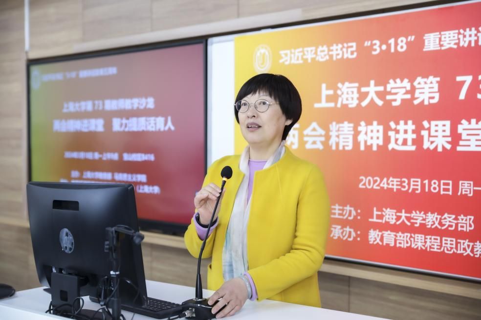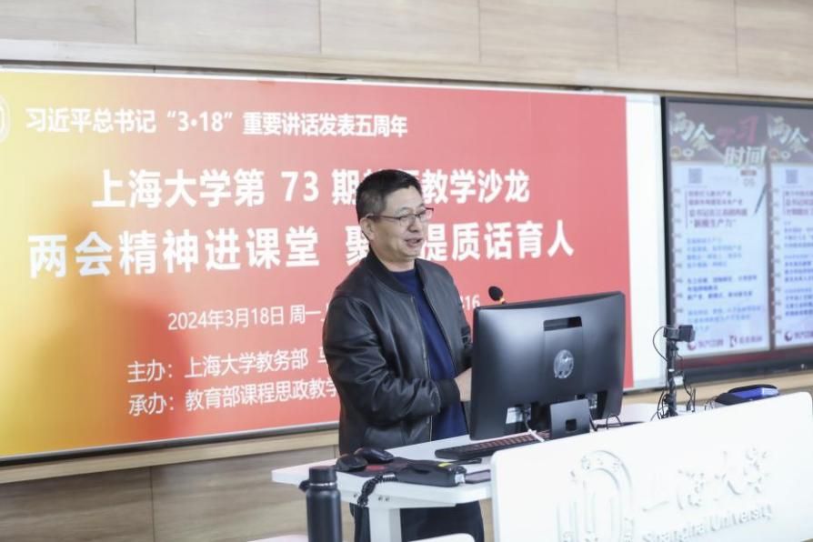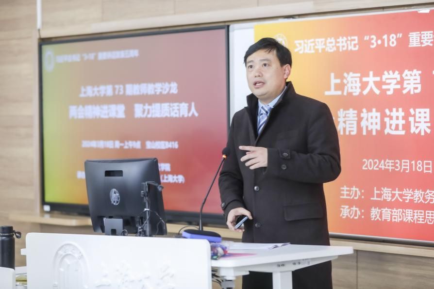 为重温2019年3月18日习近平总书记在学校思想政治理论课教师座谈会上发表的重要讲话精神,及时有机融入党的二十大精神和两会内容,聚力提升思政课和各类课程教学质量,2024年3月18日,beat365英国官方网站在宝山校区B416举办专题教学沙龙。本次沙龙由beat365英国官方网站教务部、马克思主义学院主办,教育部课程思政教学研究示范中心(beat365英国官方网站)承办。来自马克思主义学院、理学院、材料科学与工程学院、计算机工程与科学学院、生命科学学院等40多名一流课程、课程思政示范课程教师参会。沙龙由教务部副部长、教育部课程思政教学研究示范中心(beat365英国官方网站)负责人顾晓英教授担任主持。beat365英国官方网站党委副书记、副校长胡大伟出席。