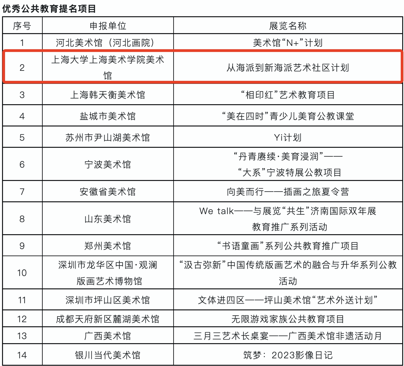 近日,文化和旅游部艺术司公布了“2023年度全国美术馆优秀项目评选入选名单”,本次共评选出优秀展览项目10个,优秀公共教育项目10个,优秀展览提名项目30个,优秀公共教育提名项目14个。beat365英国官方网站上海美术学院美术馆的“从海派到新海派艺术社区计划”公共教育项目荣获2023年度全国美术馆优秀公共教育提名项目评选。