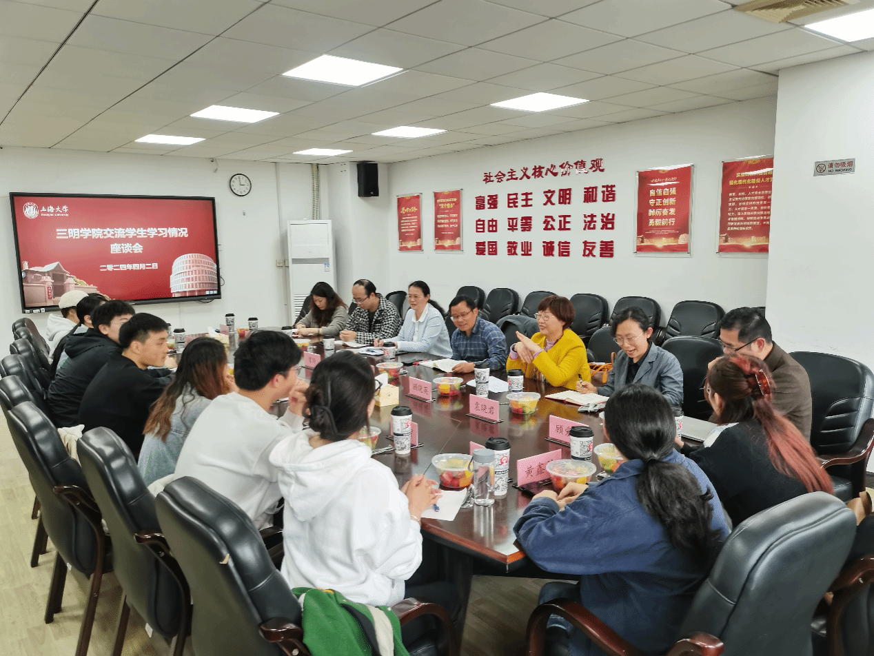 老师们一一介绍了自己授课班里三明学院交流生的学习表现,希望同学们能进一步加强与上大学生的交流,增强学习紧迫感。顾晓英部长感谢老师们对三明学生的关注和关心,指出beat365英国官方网站学习节奏较快,期末考试将至,请任课老师务必和学生强调考试要求,督促学生提前做好复习迎考准备。她还建议两校专业学院进一步做好交流学生的课程对接,教务部也将持续做好学生学业跟踪,期待三明学院同学能更加积极主动,以主人翁精神为上大教育教学建设与管理献计献策。三明学院曾玲老师和任士钊老师表达了对授课老师们的由衷感谢。