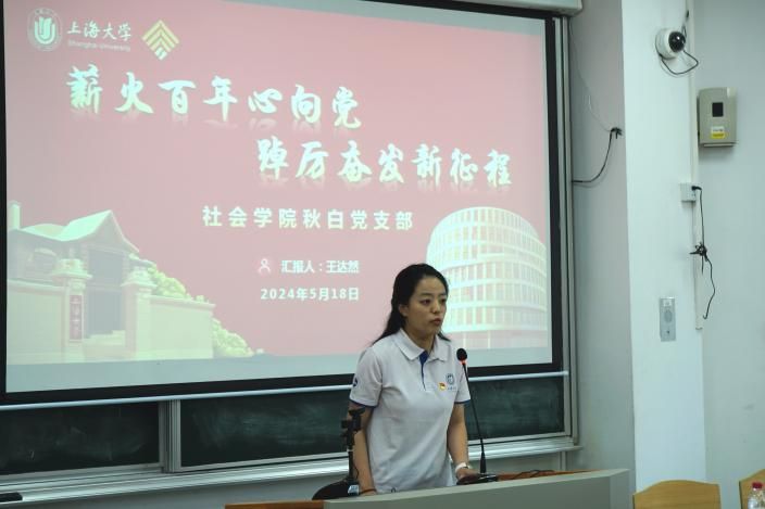秋白党支部书记王达然对秋白党支部的基本情况进行了介绍。作为跨专业、跨年级,包含本硕博学生党员的融合型党支部,秋白党支部入选了上海高校“百个学生样板党支部”,在理论学习、研学实践、“党建+美育”等方面不断走深走实,坚持以百年上大的红色基因为价值导向,用红色党史、校史、院史赋能时代新人培育,取得了累累硕果。支部党员在专业学习、社会实践等各方面勇攀高峰、奋勇争先。未来,秋白党支部也将继续弘扬秋白精神、擦亮支部名片。