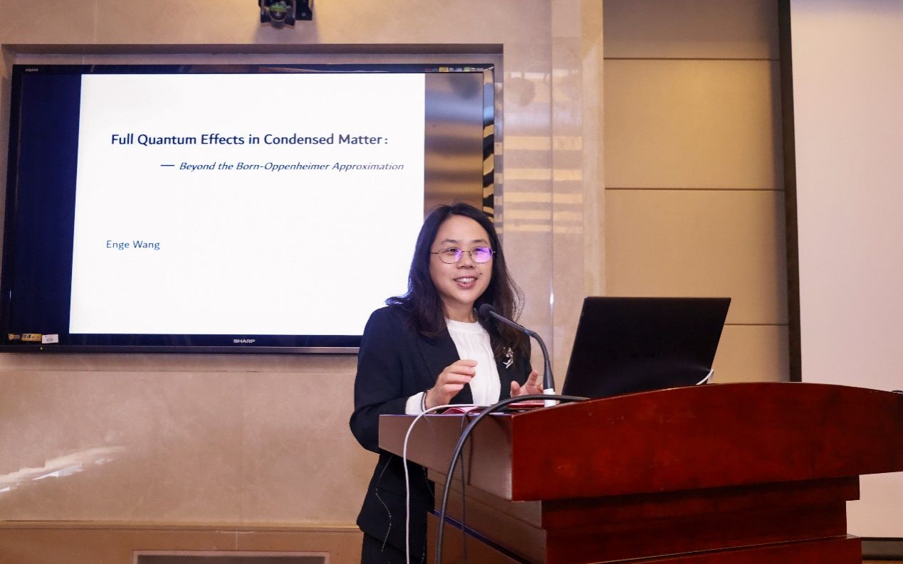 王恩哥院士基于凝聚态发展史,从薛定谔方程出发介绍了凝聚态物理中的经典问题,引出玻恩-奥本海默近似中所忽略的非绝热近似。他指出,在过去的凝聚态物理研究中,将原子核作为一个简单的球棍模型的“球”是不够严谨的,而只有将原子核像电子量子化一样进行原子核量子化,才能准确描述材料的物理和化学性质,也就是需要进行全量子化效应的考虑。在此基础上,王院士介绍了其团队将氢、碳等轻元素的原子核量子化而开展的一系列科研工作,如:“单个离子水合物的人工制备”,“水合钠离子的原子级分辨图像”,“二维冰的生长和表面预融化”等,表明全量子化效应对于理解水等材料的微观结构和反常特性至关重要。相关成果2022年至2024年,在Nature、Science等正刊连续发表。