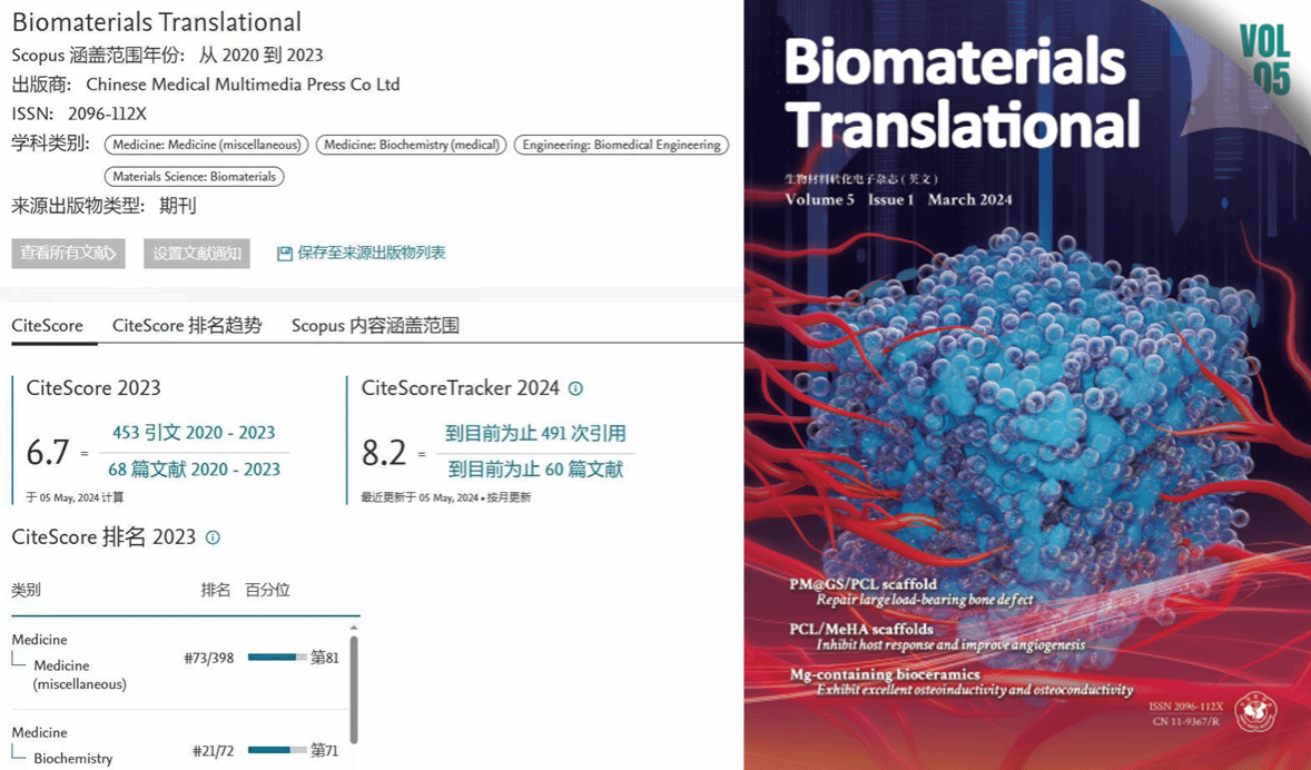 beat365英国官方网站2023年引进的合作刊《生物材料转化电子杂志(英文)》获得首个CiteScore为6.7。在Medicine (miscellaneous)学科398种出版物中排名第73位,进入Top 20%,位于Q1区。数据显示,该刊2024年的引证分目前已达8.2,发展势头喜人。