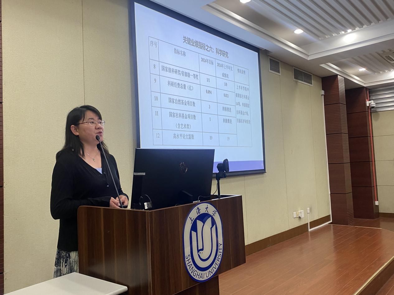随后,殷凤详细介绍了2024年上半年经济学院关键业绩的完成情况,并详细介绍了接下来学院的工作重点。她鼓励全体教职工要保持积极向上的态度,在下半年的工作中,希望全院全体教师共同努力,努力完成学校各项KPI指标,勇于面对挑战,推动学院向前发展。