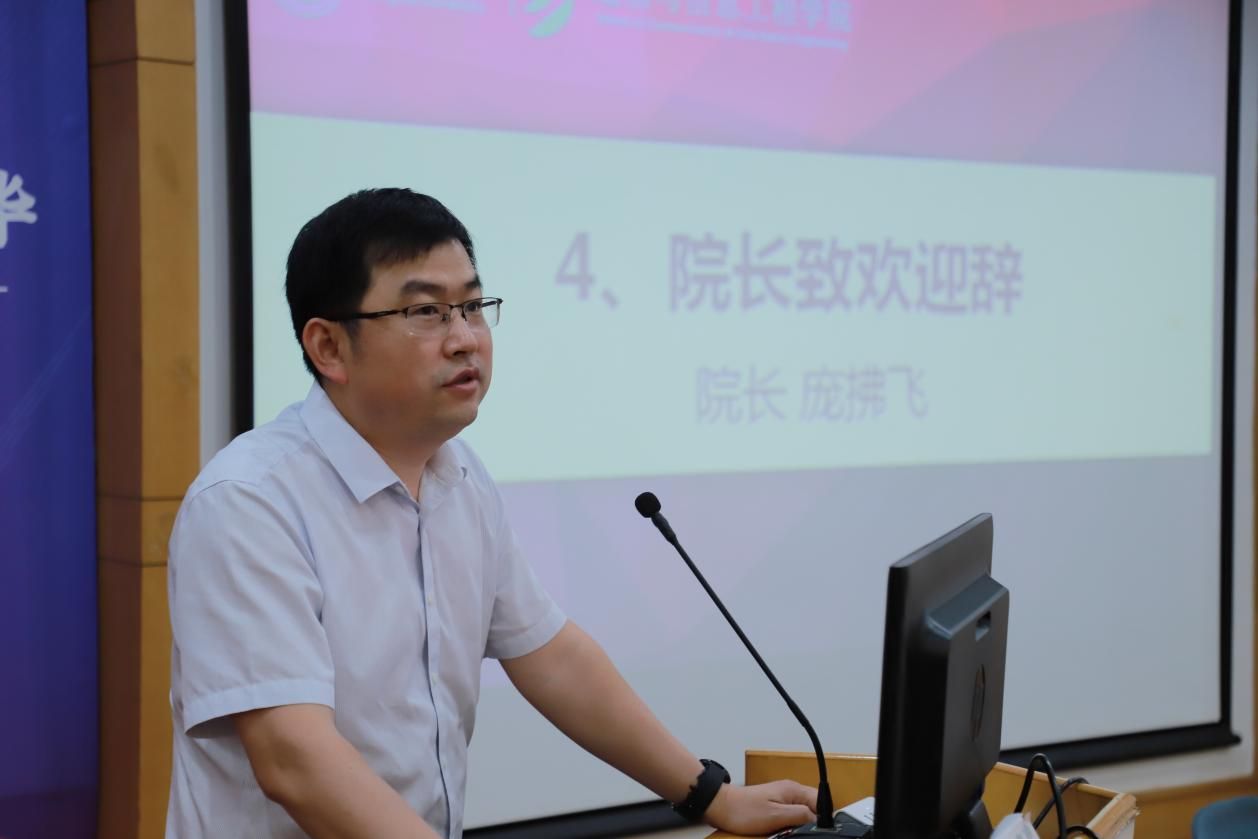 通信学院院长庞拂飞老师致欢迎辞,热烈欢迎同学们加入通信学院的大家庭。他指出通信学院拥有优秀的师资队伍、教学资源与科研平台,旨在培养新一代信息技术人才,希望同学们做到以下三点:在学院增长知识与本领,培养国际视野,更好地服务社会;志存高远追求卓越,多参加实践项目与竞赛;始终保持对知识的渴望与学习的热情。