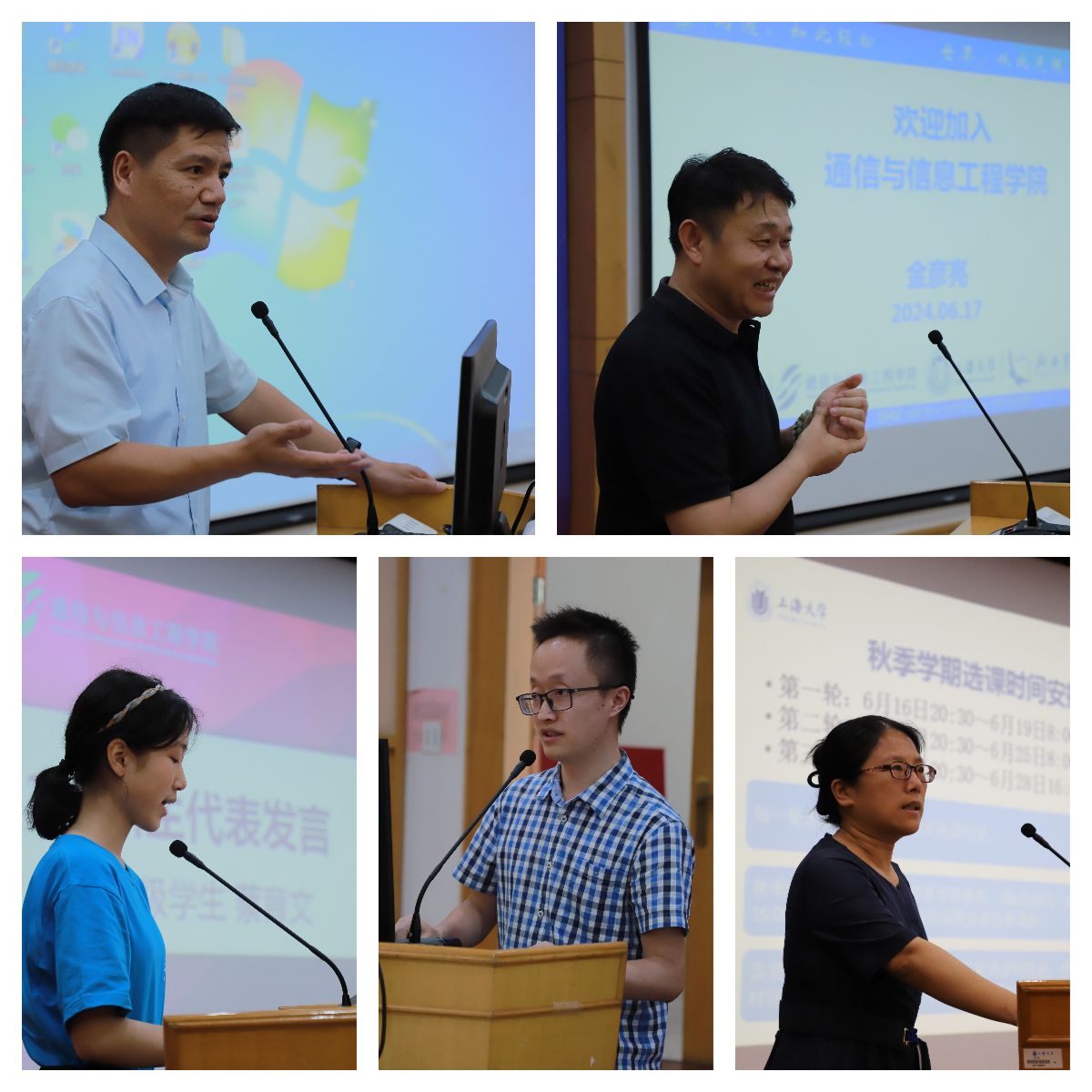 王子驰老师作为2023级班主任代表发言,他回忆了13前来到上大开启本硕博读书的经历,现在成为一名班主任,希望成为2023级学生的引路人,帮助同学们在通信学院后三年的专业学习中答疑解惑,欢迎同学们与班主任、全程导师交流。祝愿同学们能够快速适应通信学院的学习生活,取得满意的成绩。