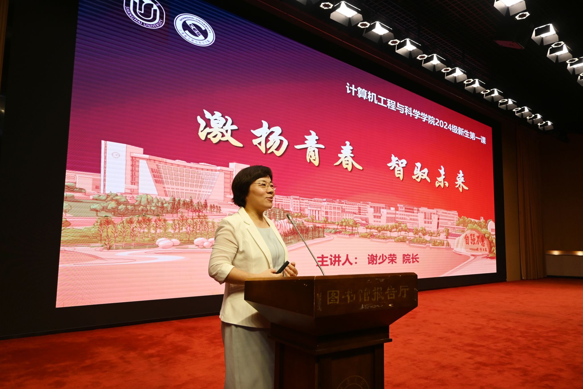 学院党委副书记、院长谢少荣带来主题为《激扬青春,智驭未来》开学第一课。院长从社会发展趋势、学院概况、主要科学研究、学院“1024”人才培养举措等方面出发,详细介绍了计算机学院的历史沿革、发展成就及人才培养成果。