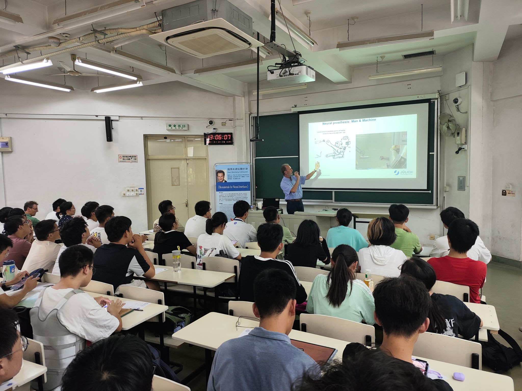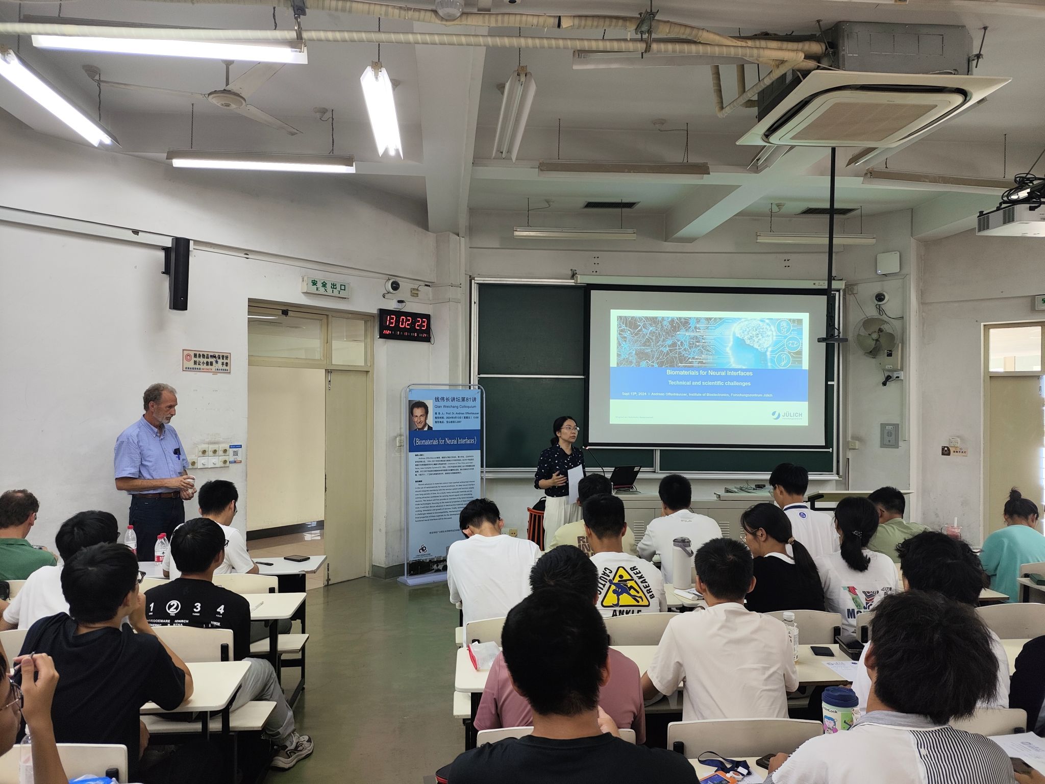 本次讲座中,Andreas Offenhäusser教授首先指出,材料科学的最新进展引发了人们对于纳米材料应用于神经假体的广泛兴趣。一个理想的神经接口应该与神经系统无缝衔接,并且具有耐久性。因而,许多纳米材料成为当下感测信号和刺激神经元的首选。教授还重点具体地分析了各类微器件材料的特性、功能和应用利弊,指出对生物材料信号交互性、生物相容性、机械稳定性等方面的要求,分类分析了不同种类的电活性材料及其微器件在记录、刺激和神经元生长方面的研究进展。并聚焦于电极植入体的异物反应问题,当下神经生物功能材料面临的技术难题和科技挑战,启发同学们在神经界面等相关领域开展思考与学习。
