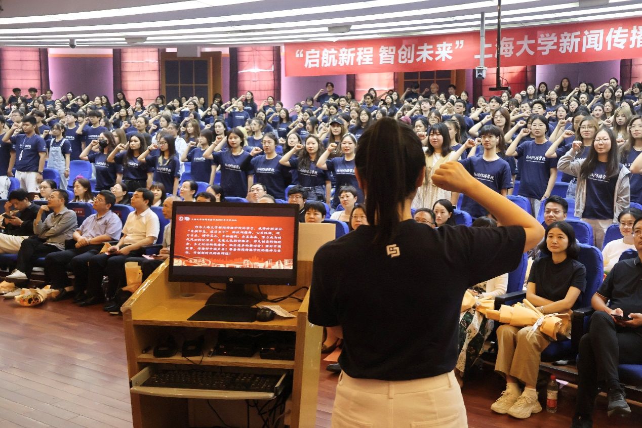 在2024级新闻与传播专业硕士研究生陈可欣的带领下,会场内的同学们举起右手,庄严宣读新闻传播学院入学誓词。每一代人都有其独特的使命与追求,新生们以坚定的誓言表达了新传学子对学术追求的坚定信念,同时也彰显了他们勇于承担时代赋予的重任,不畏艰难,在变革的浪潮中勇拓未来的豪情与壮志。
