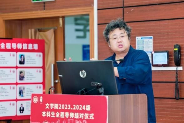 随后举行师生结对仪式,分别由2023级本科生代表和2024级本科生代表为各自年级的导师代表送上绿植并合影留念,希望桌案上这一抹绿色能为导师驱散疲惫,也代表着学生的敬意与感谢。顾甦泳老师作为2023级学生全程导师代表,向同学们分享了鲁迅先生在作品《导师》中的一段话,给予同学们勉励与动力。2024级学生全程导师代表,文学院副院长杨长云老师则对同学们的未来提出了要求与期待,他希望同学们能够珍惜学校提供的学习和发展机会,好好享受在文学院学习生活的时光,实现自己的梦想,也希望老师们能够在做人、做事、做学问方面进行尽心尽力,做好人文关怀,带领同学们实现梦想。