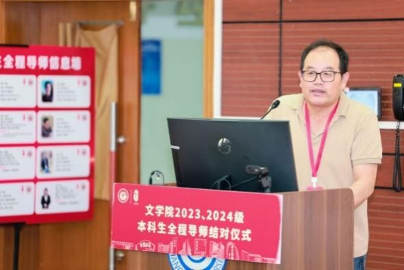 最后,文学院党委副书记、院长刘旭光老师为此次结对仪式作总结讲话。他表示希望通过全程导师制度帮助同学们尽快融入大学生活,并在科研方面找到自己的兴趣特长。同时他鼓励同学们加入本科生科研训练计划,培养同学们对人文学术的兴趣,增进对科研的了解,领悟人文学术的价值与意义。