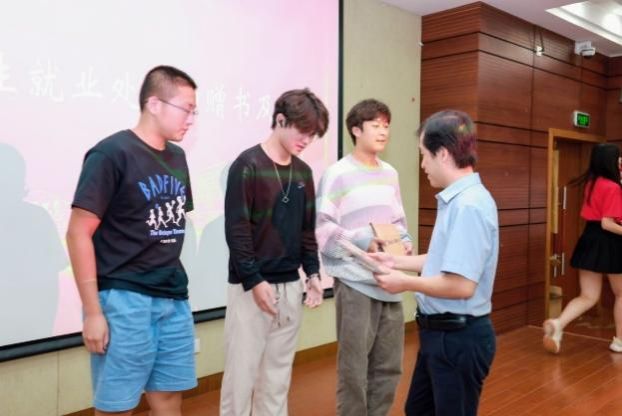 在今年开学之初,文学院2024级本科新生中有8个寝室的32位同学十分荣幸地与招生就业处的8位老师进行了结对,享有“1+1双导师制”,这些同学不仅有一位专业课全程导师的指导,还有招生就业处的生涯指导导师为同学们保驾护航,帮助同学们在学术与未来职业发展之间找到平衡和方向。校招生就业处副处长陈涛老师作为导师代表为结对学生赠书并寄语。陈老师表示希望同学们能珍惜并利用好资源,好好读书,成长为社会栋梁之才,并祝愿文学院在师生共同努力下创造新的辉煌。