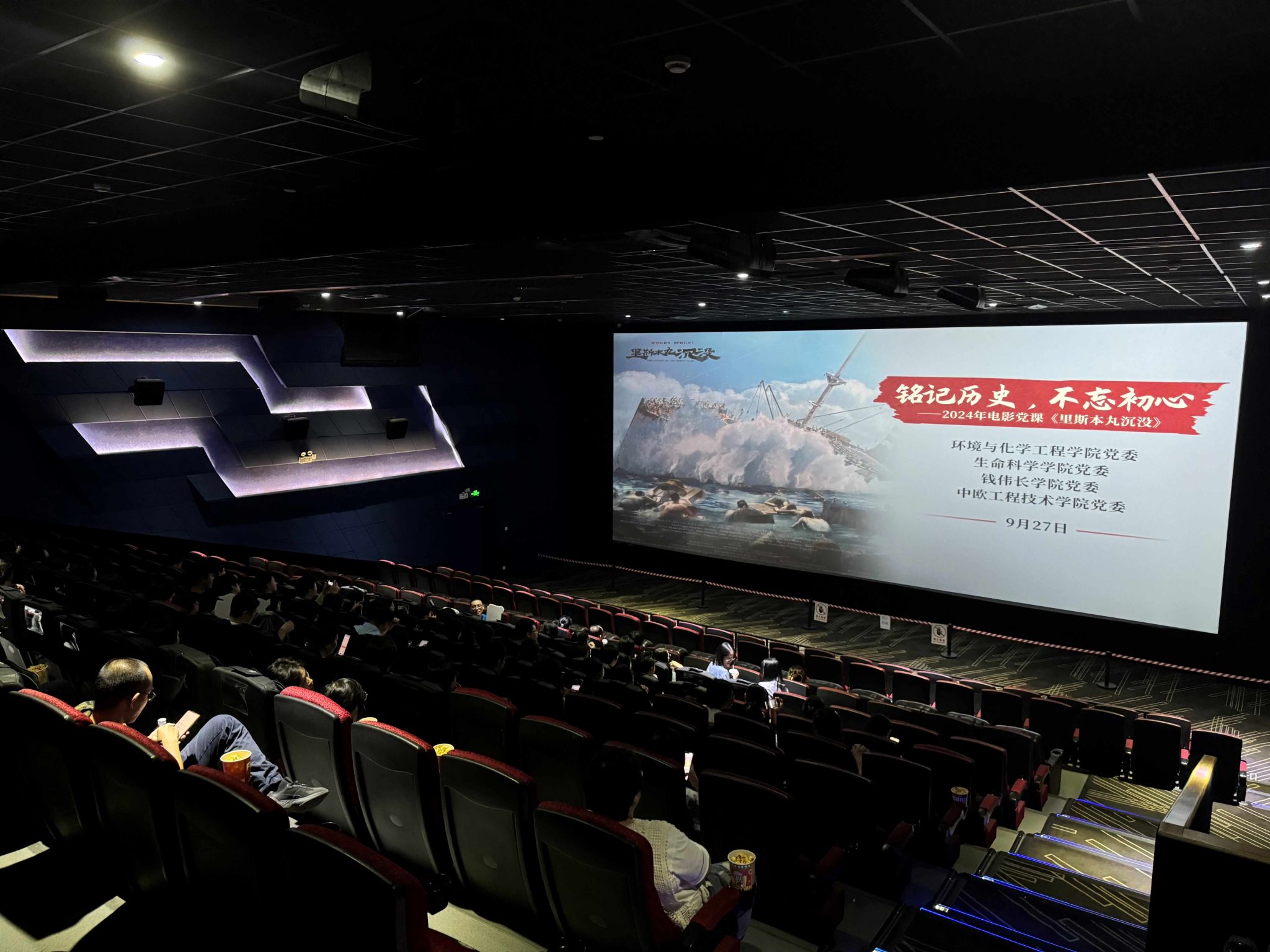 为热烈庆祝中华人民共和国成立75周年,促进广大师生厚植爱国情怀、砥砺强国之志,增强历史责任感与使命感,环境与化学工程学院党委牵头联动生命科学学院、钱伟长学院及中欧工程技术学院党委,环境与化学工程学院团委分别于9月27日和28日组织师生党员、团员代表集中观看了爱国主义题材电影《里斯本丸沉没》。