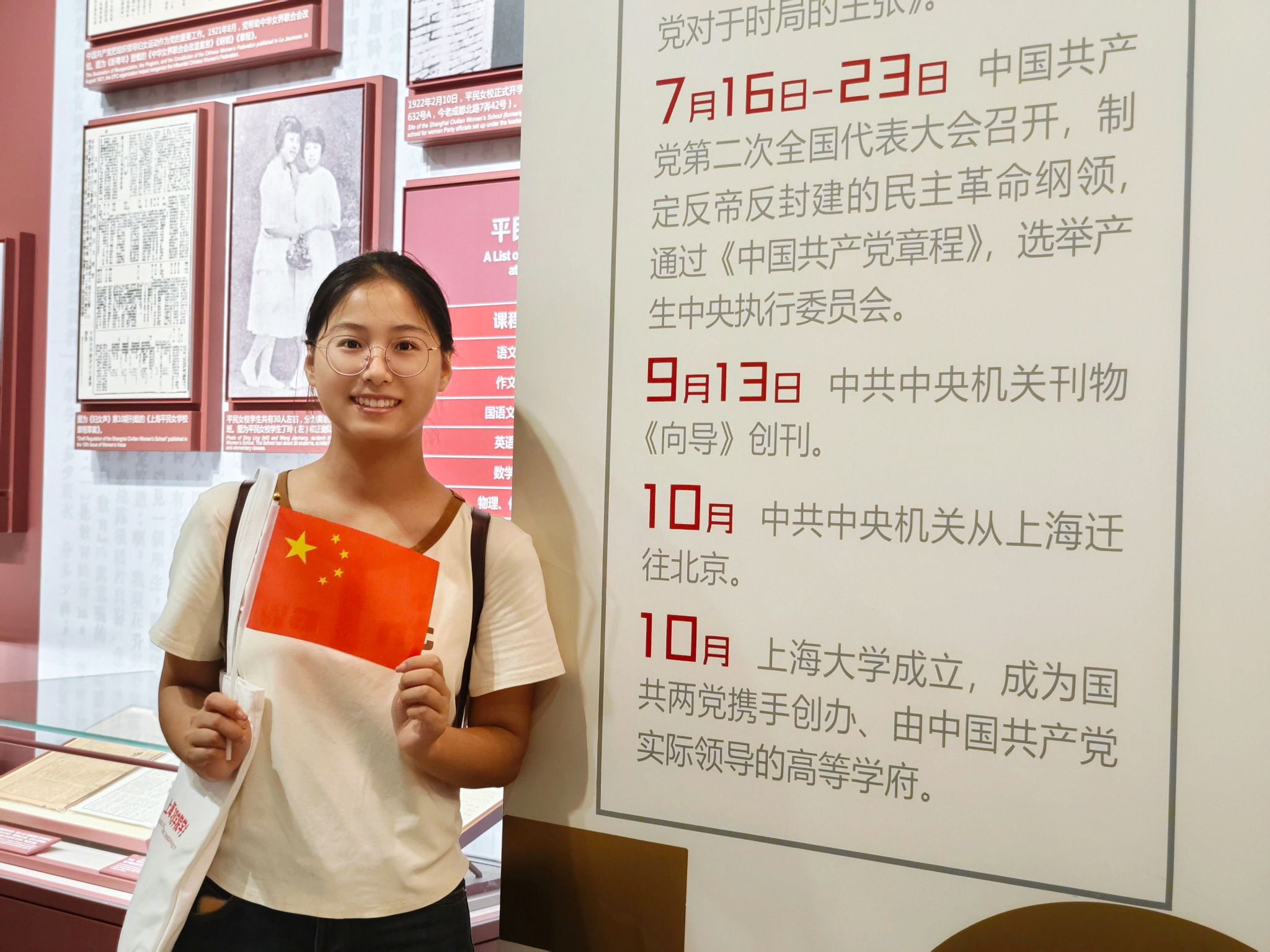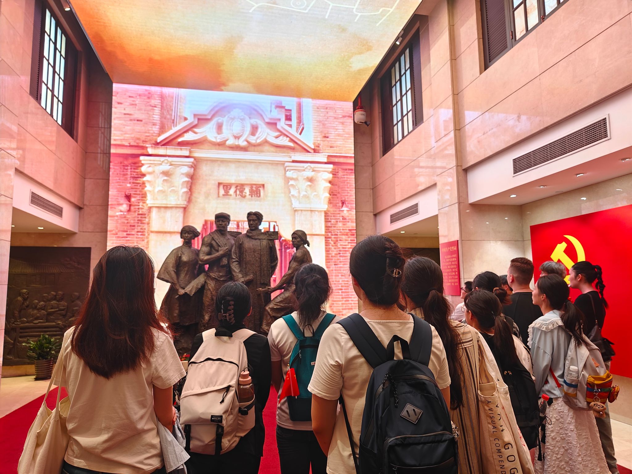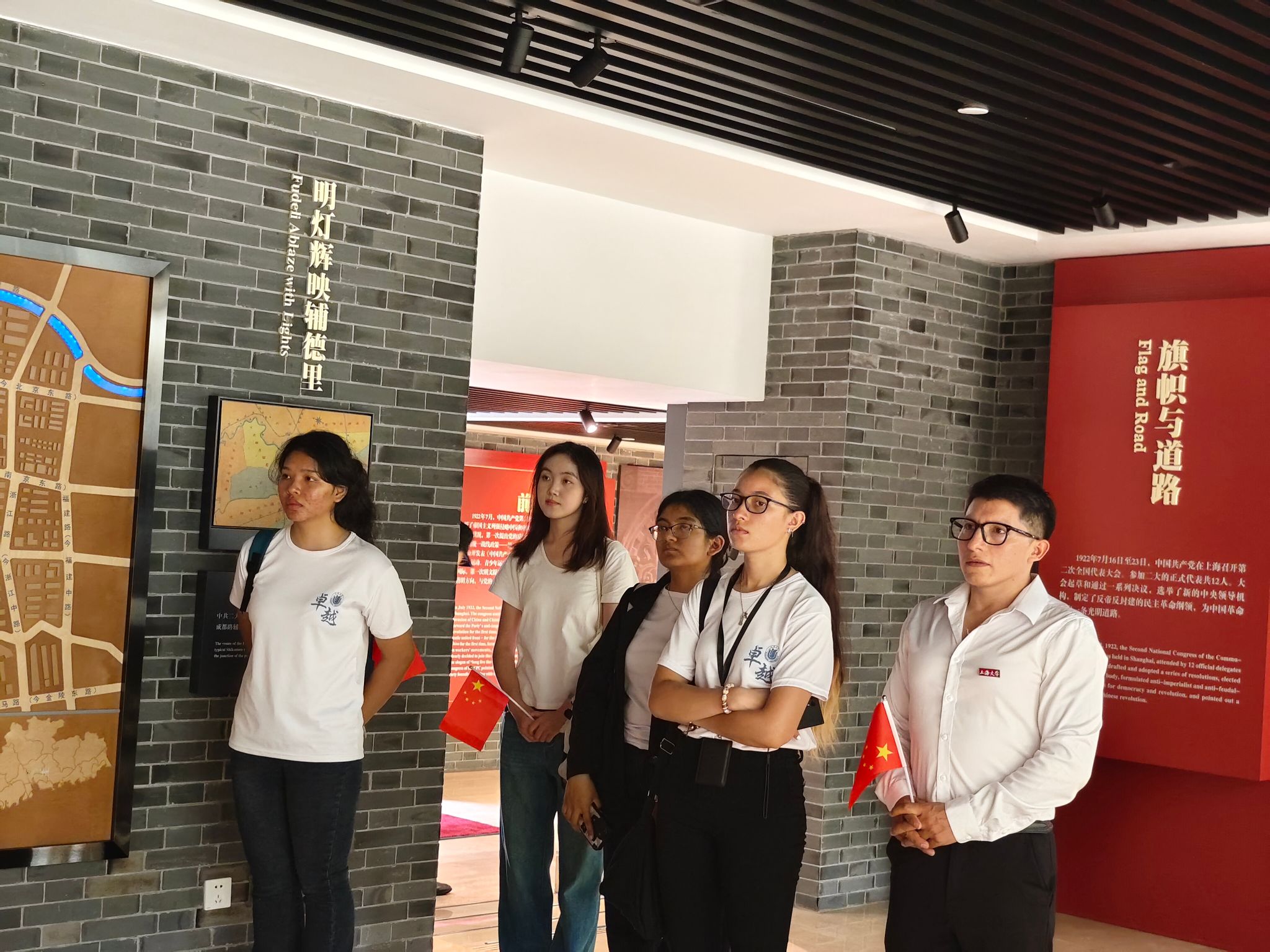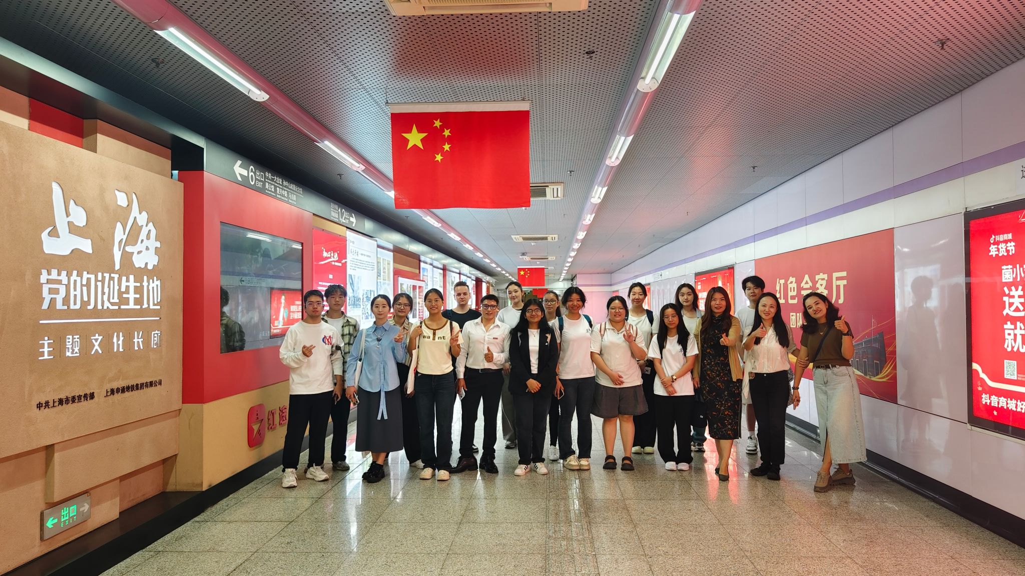 中共一大会址是中国共产党的诞生地,是中国革命的起点。在这里,同学们可以深刻感受到中国共产党人开天辟地、敢为人先的首创精神和坚定理想、百折不挠的奋斗精神。在前往中共一大会址的地铁走廊中,同学们就已经感受到了历史的厚重。五星红旗的鲜艳色彩,仿佛在为国庆的到来提前庆祝,激发了同学们对即将开始的红色之旅的期待。每一步都踏在历史的回响上,每一次呼吸都充满了对过去的敬意。