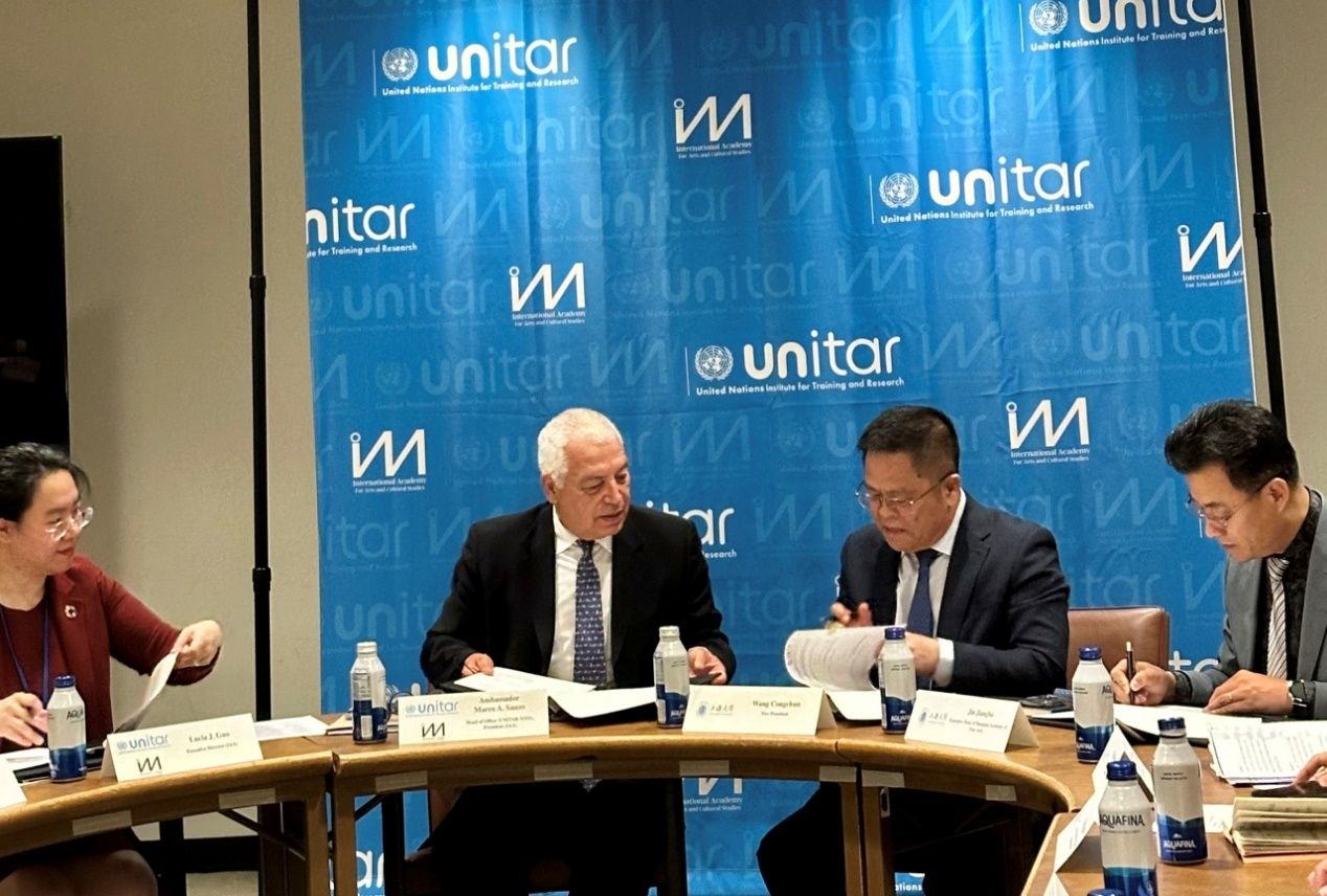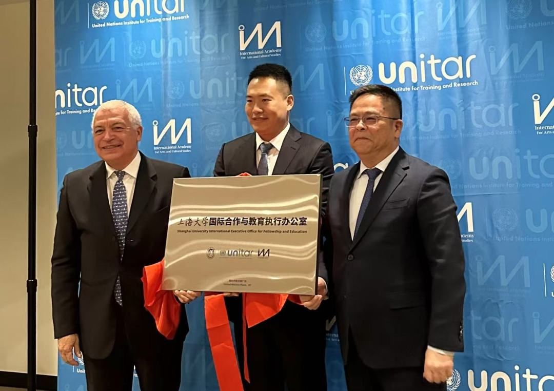 在纽约,代表团访问了联合国训练研究所及其所属的全球文化与艺术组织。王从春副校长与联合国训练研究所所长、全球文化与艺术组织主席Marco A. Suazo大使进行了会晤。双方共同签署了谅解备忘录,并为“beat365英国官方网站国际合作与教育执行办公室”揭牌。双方就后续合作进行了深入交流,将共建国际文化、科技和艺术教育中心,全球城市更新与可持续发展学术智库,助力beat365英国官方网站培养国际组织人才。