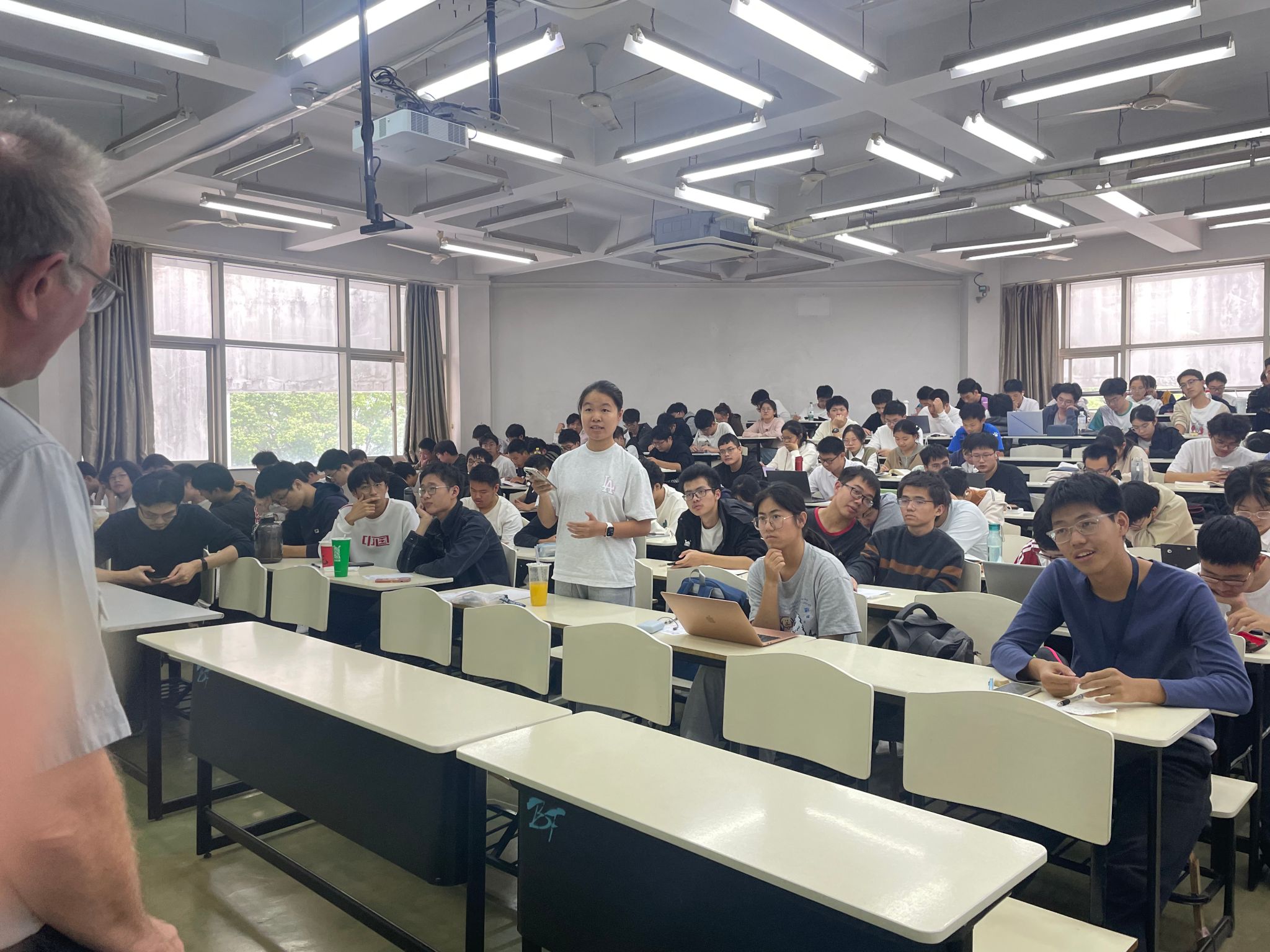 讲坛结束后,同学们向Frank Nijhoff教授踊跃进行提问,除了关于本次讲座的偏微分方程外,同学们还就数学领域的困惑疑问,学习方法等与教授进行了亲切交流。同时,许新建教授也就本次讲座向在座同学提出了两点对于未来数学学习上的期望:一是希望同学们具备将离散与连续相联系的能力,二是希望同学们具备将线性与非线性相联系的能力。他指出,坚持以上两点原则,是学好数学、研究好数学问题的基础,希望我们能在未来在数学领域做出更多的成绩!讲座在听众热烈的掌声中圆满结束。在学院系列伟长讲坛“大师引领”启发下,同学们也将持续在求知的道路上不断前行!(撰稿:陆梓清)