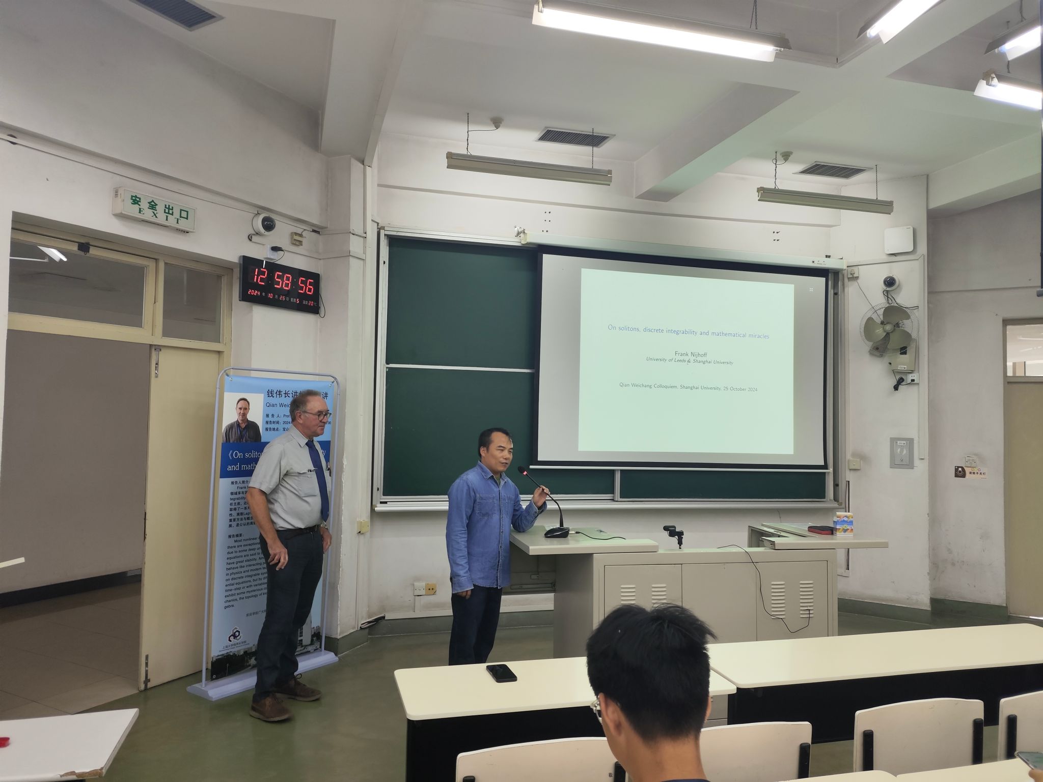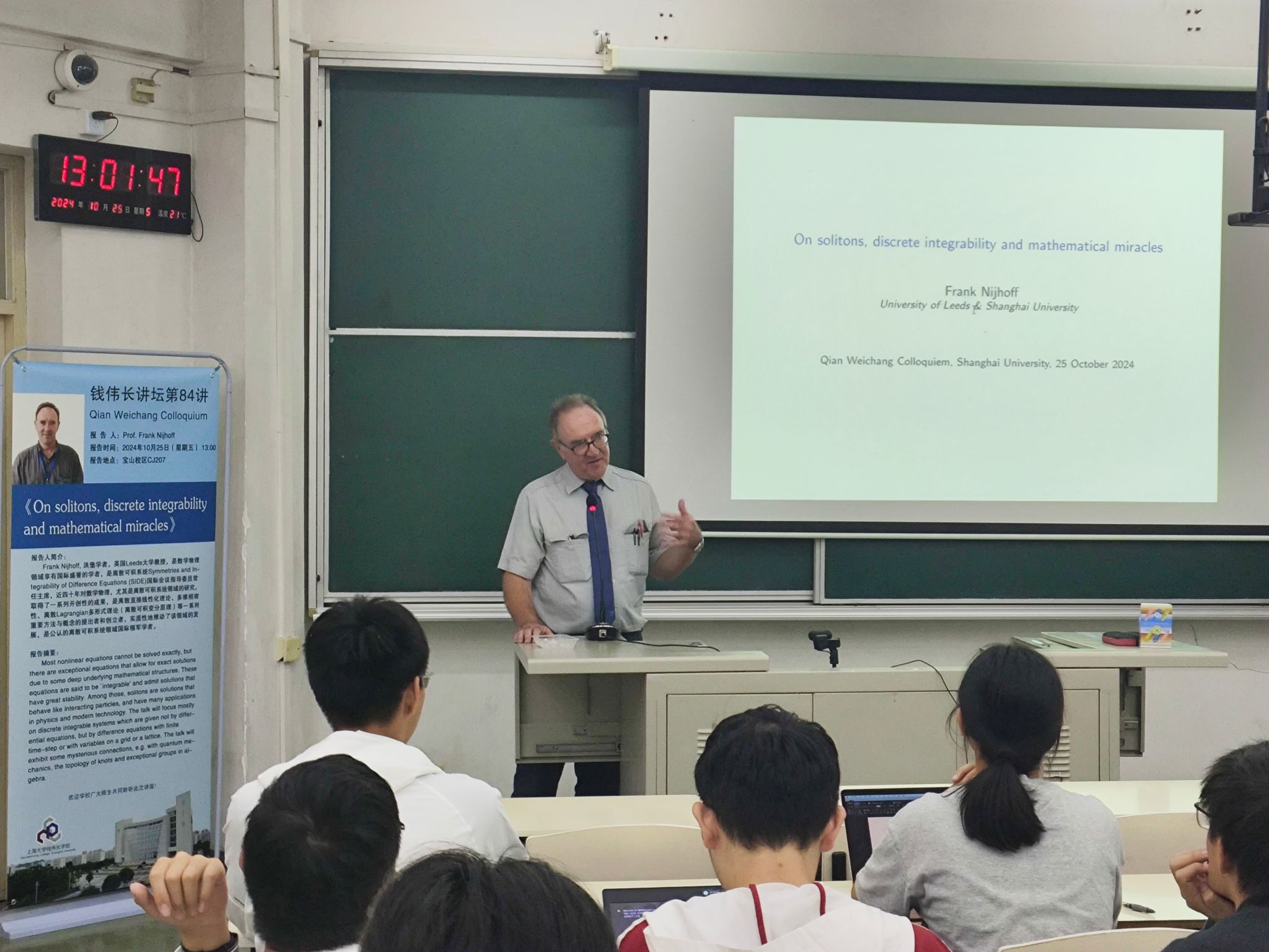 10月25日下午,钱伟长讲坛第84讲《On solitons, discrete integrability and mathematical miracles》在beat365英国官方网站宝山校区CJ207会议室顺利举行,国际著名的数学家Frank Nijhoff教授应邀作主题报告,讲坛由钱伟长学院副院长许新建教授主持,钱伟长学院团委书记魏仲奇和24级本科生等共同出席了本次活动。