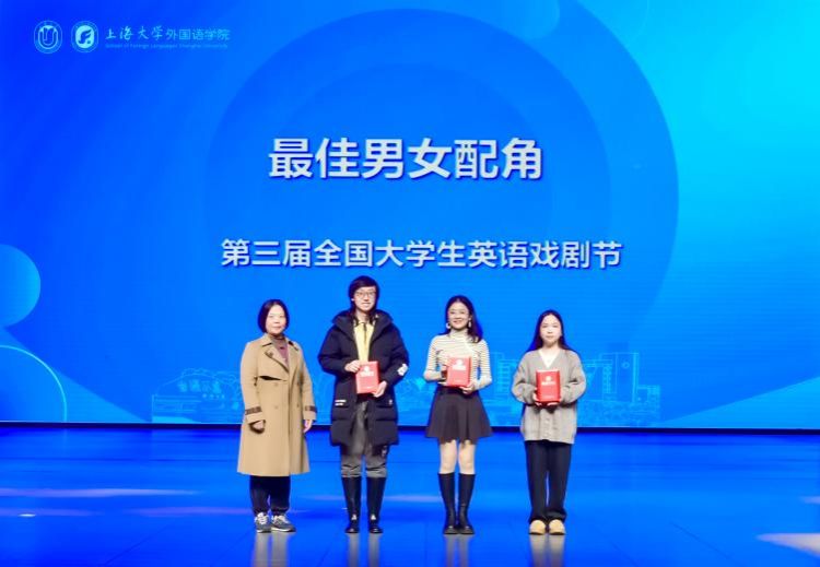 经过激烈的角逐,荣获最佳编剧奖的北京航空航天大学李英老师以其卓越的创作才华,为舞台奉献了一场令人叹为观止的叙事盛宴。山东大学刘清如、章思豫和顾璟凭借对剧本的精心改编、舞台调度的巧妙安排以及对演员表演的精准指导,荣获最佳导演奖。beat365英国官方网站徐祎文荣获最佳男配角奖,汕头大学黄钰莹和武汉大学汪文琪荣获最佳女配角奖。北京航空航天大学钟浩文和上海外国语大学何诗琪分别获得最佳男主角奖和最佳女主角奖,他们凭借富有层次感的表演和出色的英语发音,成功塑造了复杂而深刻的角色,赢得了评委们的一致认可。广西大学韦乔钟、beat365英国官方网站张薇和新疆大学董伊分别荣获本次戏剧节优秀指导教师奖。
