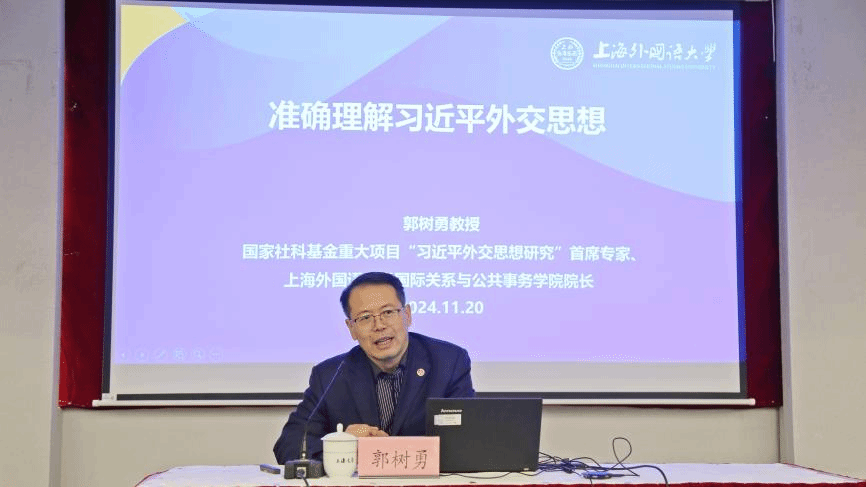 上海外国语大学国际关系与公共事务学院院长郭树勇教授做以“准确理解习近平外交思想”的专题讲座。郭教授结合丰富案例详细介绍了习近平外交思想的基本内容、丰富发展及其体系化学理化国际化研究,并结合党的二十届三中全会精神与中央外事工作会议精神,对习近平外交思想如何指导实践工作进行了阐释。