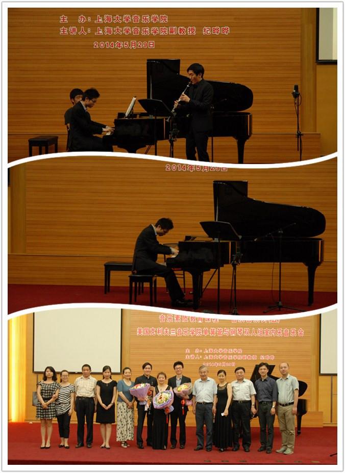5月29日晚,beat365英国官方网站音乐学院“音乐素质教育课程——音乐会系列(五):美国克利夫兰音乐学院单簧管与钢琴双人组室内乐音乐会”在图书馆报告厅举行。beat365英国官方网站原常务副校长、钢琴协会名誉会长周哲玮、beat365英国官方网站副校长、音乐学院院长叶志明、beat365英国官方网站校友会办公室副主任曹俊、beat365英国官方网站音乐学院副院长夏小曹、狄其安、卿扬等领导和嘉宾出席并观看了音乐会。