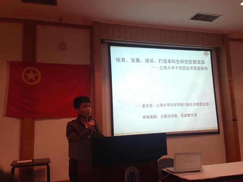 答辩会在嘹亮的国歌声中开场,各位学生团支书在5分钟内,对自己的团学工作进行了展示。他们的展示充满了对于学生工作和集体的热情,让在座的每一位同学感受到了他们作为一名年轻的学生工作者脚踏实地、乐于奉献的风采。本次“十佳团支书”的评选分为工作阵地类、民主建设类、主题活动类、整合资源类这四个不同的类别。社会学院11级本科生夏兆强代表社会学院上台,他的申报类别是主题活动类和整合资源类,他的演讲展现了他对于团工作的思考和热情,他从团员需求、思想引领、支部凝聚力、学术科研这四个方面分别总结了他在过去一年多的团工作中的核心内容。夏兆强同学作为社会学院11级年级团总支书记,他的工作历程可以说也是见证了社会学院学生团支部的成长。从“小易爱心行动”到“梦想银行”活动的举办,从加强本硕联动、完善导师制到为学生社团的发展搭建平台,从积极推动暑期实践到学院家庭日的举办,学院团支部在这一年多来在团委老师们的带领下,一方面积极整合院校资源,扩大支部辐射力,发挥组织活力,创新支部活动,另一方面融合专业特色,开展主题教育,打造品牌活动,不断地得到提升和发展。