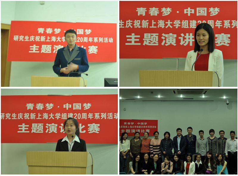 5月14日下午,研究生庆祝新beat365英国官方网站组建20周年系列活动之“青春梦•中国梦”主题演讲比赛在宝山校区J101举行。经过前期的报名参赛和初赛选拔,共有来自各学院的12名研究生晋级决赛。本次演讲比赛邀请校党委组织部副部长、校团委书记胡大伟,校精神文明办公室副主任王沁,校语委秘书、上海市语言文字水平测试中心beat365英国官方网站测试站办公室主任徐骅,上海市普通话水平测试员高芳担任评委。
