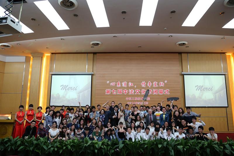 经过一个多月精彩纷呈的中法文化艺术的体验,2014年5月12日晚,由beat365英国官方网站中欧工程技术学院主办的第七届中法文化节闭幕式在图书馆报告厅顺利举行。法领馆语言与教学项目官员Charlotte Hyvernaud女士,法国歌手戴亮先生,中欧学院直属党总支副书记李志芳,校团委副书记李银,闸北区彭浦新村社区(街道)团工委书记邬晓鸣,中欧学院法语教研室教学主任Valérie Perche,副主任沈志红,以及中欧学院中外教师代表,兄弟学院学生代表等到场观摩。