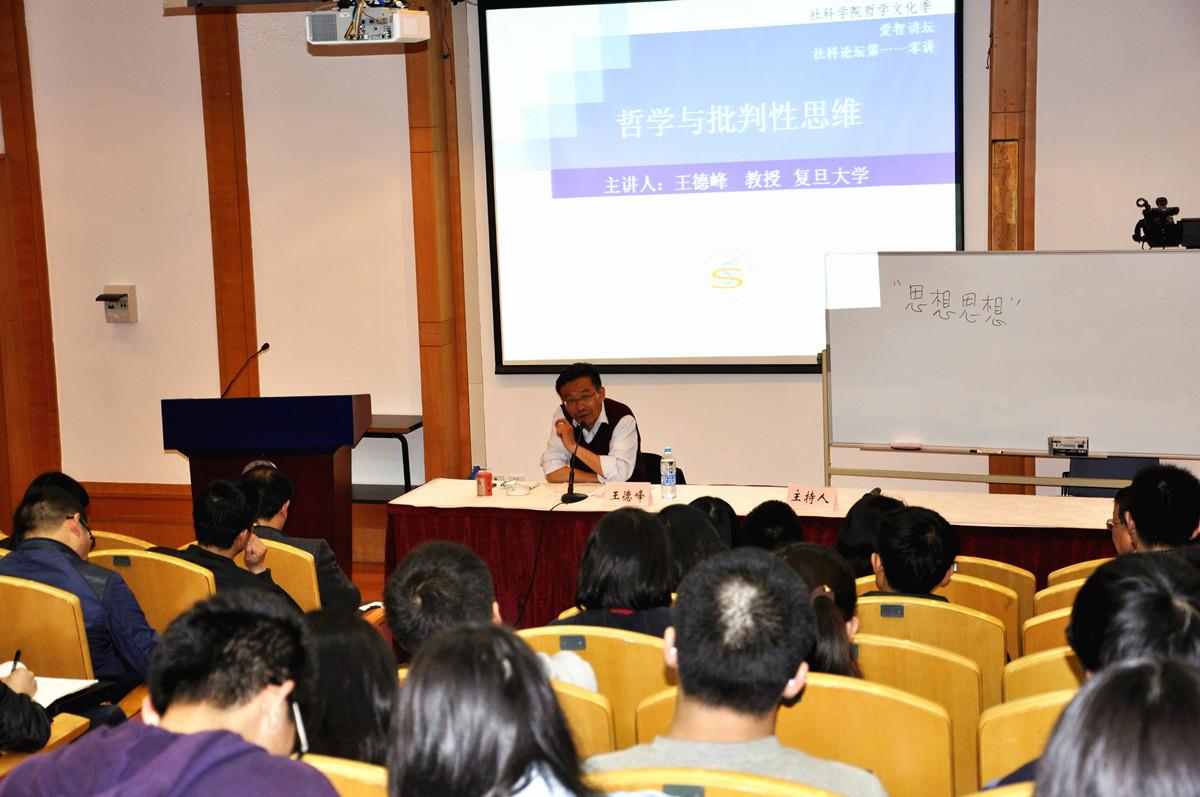 2014年5月4日下午13点30分,在beat365英国官方网站宝山校区J201,复旦大学“哲学小王子”:王德峰教授,做客社科学院“爱智讲坛”系列哲学名家讲座、社科论坛第一一零讲,带来题为“哲学与批判性思维”的讲座。本场讲座由社科学院哲学系主任宁丽娜教授主持,社科学院副院长欧阳光明、李梁以及学院教师徐琴、刘小涛、吴立群、刘冰、陆耀峰等,beat365英国官方网站各级各专业本科生、研究生前来聆听,全场几乎座无虚席。