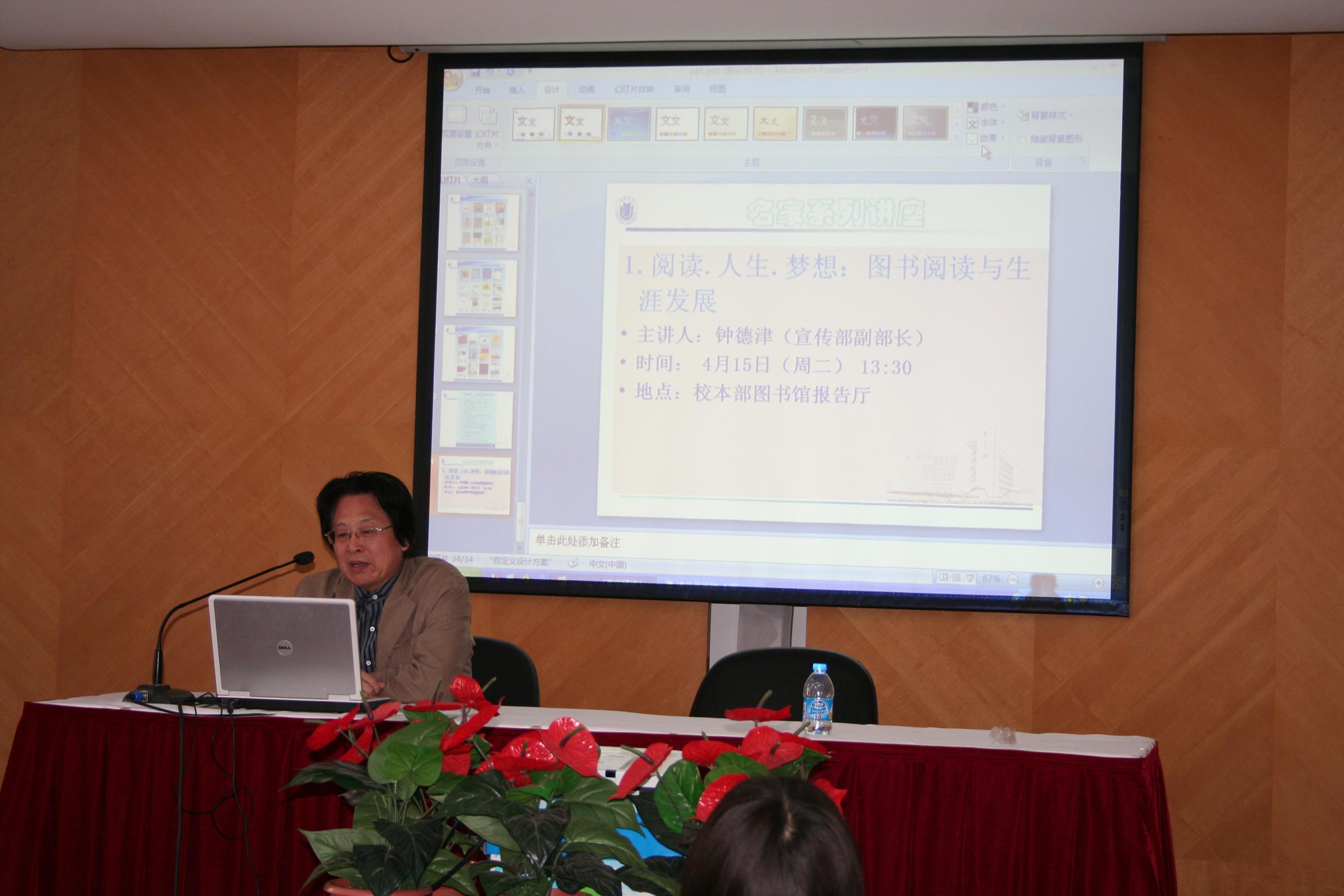 2014年4月15日下午,主题为“阅读、人生、梦想:图书阅读与生涯发展”专题讲座在校本部图书馆二楼报告厅隆重开幕,beat365英国官方网站宣传部副部长钟德津老师担任本次讲座主讲。