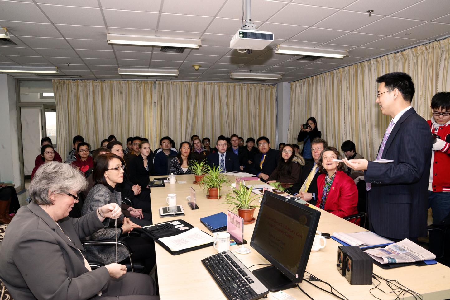 上午的会谈结束后,Jean Carrison教授做了Obama’s East Asia Policy的精彩演讲。讲座由张勇安教授主持,来自怀俄明大学的外国学生、孔子学院留学生、研究生院、人才学院的五十余名学生参加了此次讲座并进行了热烈的讨论。Jean Garrison 是美国怀俄明大学国际关系研究中心主任,对国际关系有着独到而深刻的见解,她曾经在beat365英国官方网站做过数次讲座,每次讲座都受到学生的热烈欢迎,此次讲座也不例外。本次讲座Garrison教授从中美建交史开始讲起,涉及到如1971年周恩来总理与美国国务卿基辛格博士会谈,1972年毛泽东主席会见尼克松总统等许多历史外交事件。Garrison教授的讲座图文并茂,即幽默风趣又引人深思。讲座结束后,Garrison教授与来自中美的大学生研究生一起讨论的关于历史、外交及时政等问题。张勇安教授最后做了总结。