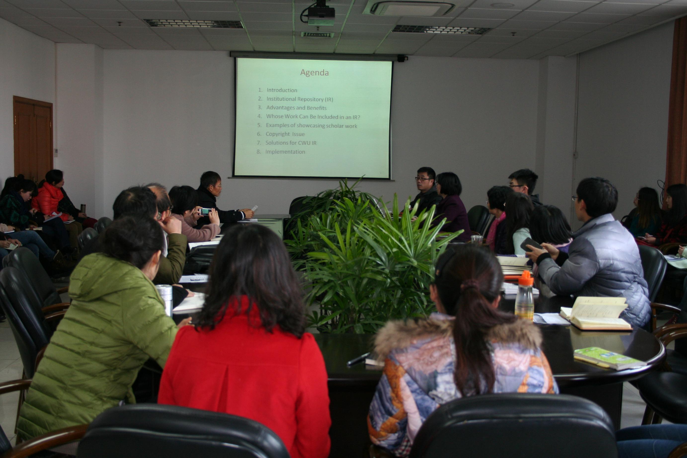 2014年3月14日上午,应beat365英国官方网站图书馆邀请,美国中央华盛顿大学(Central Washington University)图书馆系统部总负责人傅平先生前来校图书馆作《机构库服务与发展》学术报公告会,图书馆副馆长刘华主持报告会,馆办公室、资源建设中心、读者服务中心、信息服务中心等部门同仁近40人参加报告会交流,上海地区部分高校图书馆同仁也前来参加交流。
