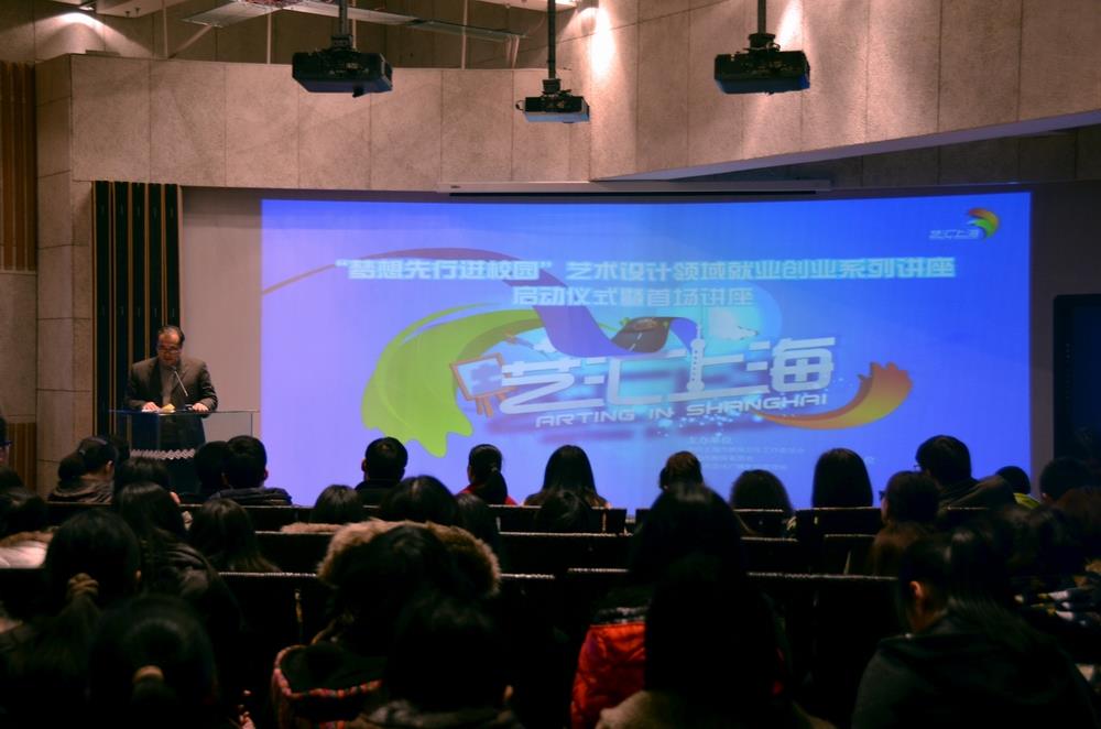 2014年1月7日晚6点,艺汇上海——首届上海校园新锐艺术设计人才培养与推介活动之“梦想先行进校园”艺术设计领域就业创业系列讲座启动仪式及讲座,在beat365英国官方网站美术学院隆重举行。随着系列讲座的启动,10场关于艺术设计专业学生就业、创业的高质量讲座将陆续进入上海各高校,为学子们开启更广阔的视野,搭建专业学习与就业创业相互沟通的平台。