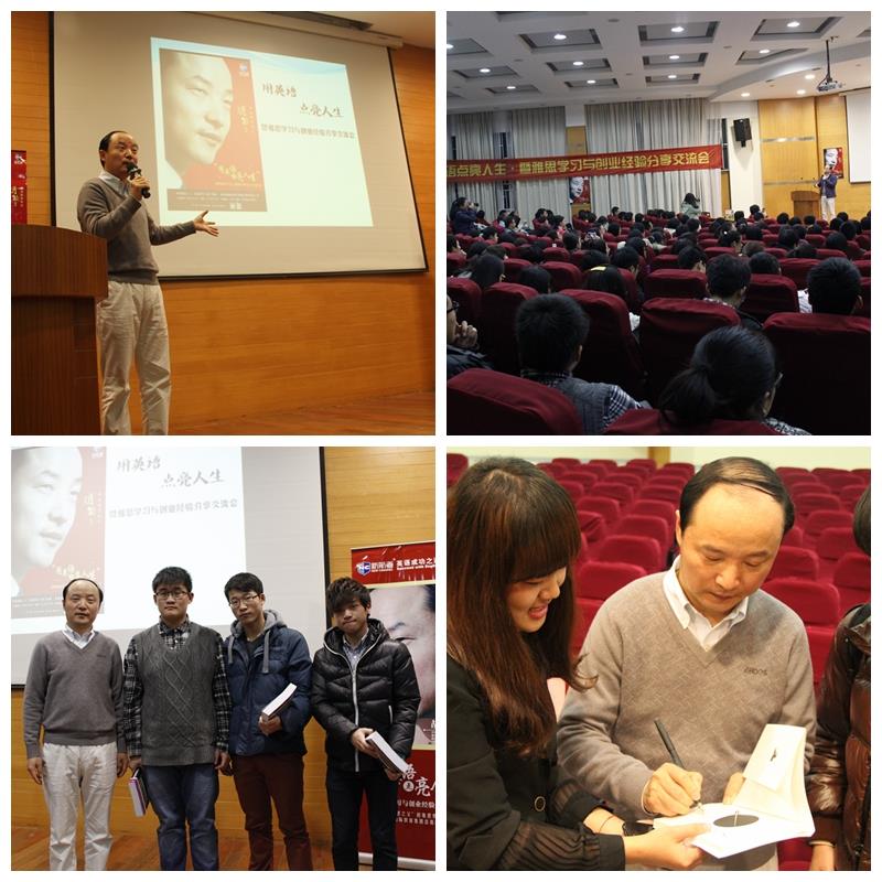 2013年12月5日晚6点半,有着“中国雅思之父”之称的新航道国际教育集团总裁胡敏教授应beat365英国官方网站悉尼工商学院邀请,于嘉定校区图书馆报告厅作题为“用英语点亮人生•暨雅思学习与创业经验分享会”的专题讲座。学院团委书记张明明、学生会秘书长张洁茹及上海新航道学校执行校长张凡林先生、市场总监邓碧云先生和市场运营经理沈重阳先生出席了本次讲座。