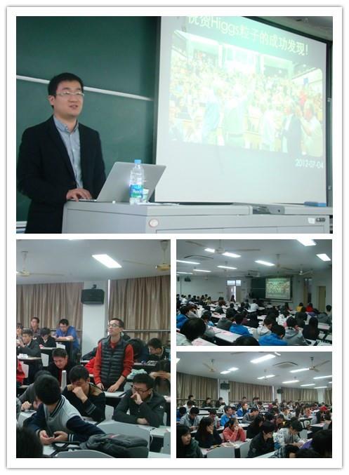 11月24日上午9点,主题为“‘上帝粒子’和粒子物理学”的学术报告在校本部GJ106热烈举行,教室早早地挤满了兴致勃勃的同学。报告由beat365英国官方网站校友、兰州大学核科学与技术学院副教授于福升主讲,于教授08年毕业于beat365英国官方网站物理系之后,先后获得了巴黎第十一大学、法国国家科学研究院直线加速器实验室联合培养博士生学位和中国科学院高能物理研究所博士学位。