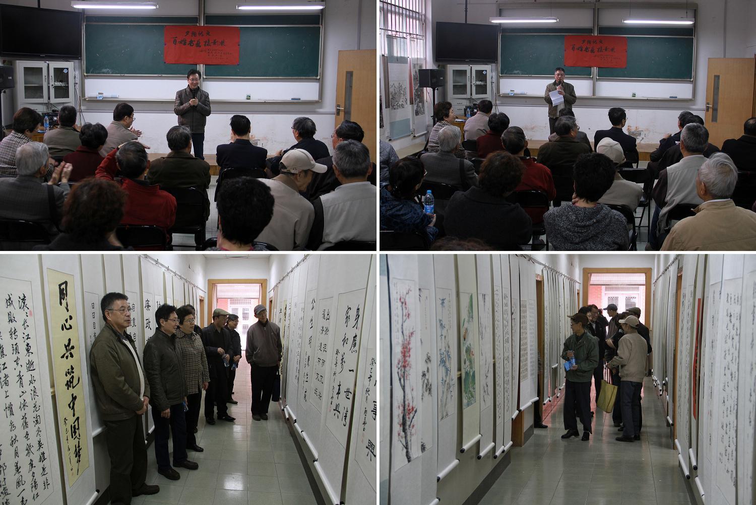 离退休工作处长、筹备组组长李玉华代表筹备组发言,向大家介绍了这次“夕阳似火”百姓书、画、摄影作品展从500多副作品中经过层层筛选、专家审核,选出200余副作品进行后期裱装,十分感谢筹备组的林焕佑和王国华老师为这次的展出付出了大量辛勤的劳动。他说,这次作品展把视角着力在“百姓”二字上,意指在艺术的世界里不论先后、不讲学历、重在参与,以喜欢为标准,以开心为目的。他说,作品中还有一部分以反腐倡廉为题材,充分展示了广大离退休教职工在党的十八大提出的扎实推进社会主义文化强国建设的今天,在全国人民梦寐以求全力实现“中国梦”的时代背景下,彰显老年风采,诠释百姓力量,把艺术带进生活,用生活理解艺术而老有所学、老有所乐的文化生活,也很好地展示了老同志们夕阳似火、晚霞更红的风采。