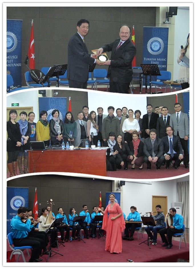 值此2013年中国的“土耳其文化年”之际,在土耳其文化旅游部,土耳其驻上海总领事馆的支持下,土耳其安卡拉伽兹大学(Gazi University)音乐学院派遣代表团于11月21日访问了beat365,举办讲座及音乐会,并与beat365音乐学院的教师和民乐团成员开展交流研讨,从而促进了两校在音乐艺术方面的交流。
