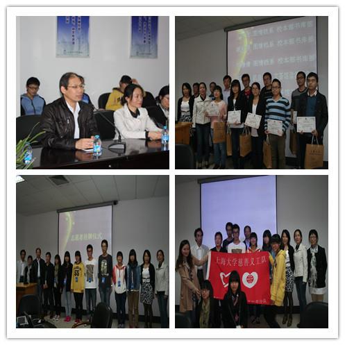 图书馆馆长助理卢志国老师和大家分享了他对志愿者工作的感想和对未来前景的展望,介绍了一些国外志愿者的有关知识,使大家增长了见识,增强了信心。“蓝纽带”服务社的志愿者们献上精心准备的诗朗诵《献给志愿者的诗》,声情并茂的表演赢得了热烈的掌声。雷严巧同学作为新志愿者代表发言。随后,举行了2013-2014新一年度志愿者挂牌仪式,各位新志愿者代表集体宣誓、与优秀志愿者代表交接“爱心服务旗帜”。图书馆领导和同学们合影留念。此次活动不仅表彰了过去一年表现优秀的同学,还极大鼓舞了同学们参与到志愿者行列中的热情。
