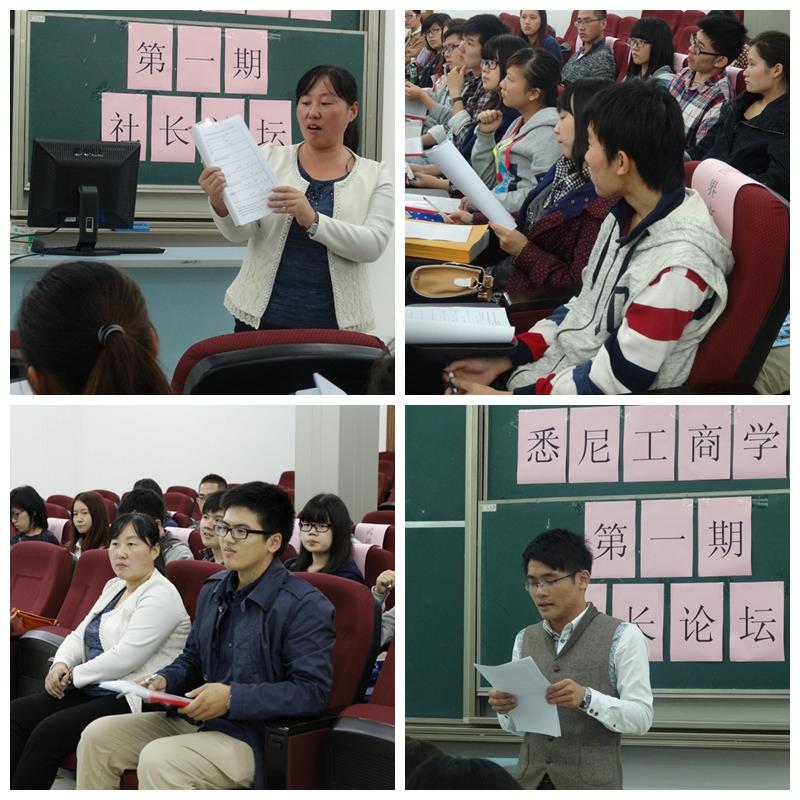 2013年10月18日下午14时,beat365英国官方网站悉尼工商学院第一期社长论坛于文德楼一楼报告厅如期召开。学院团委书记张明明老师、学生会社团联合部部长陈璟家浩、学院各大社团主要负责人出席了此次论坛。