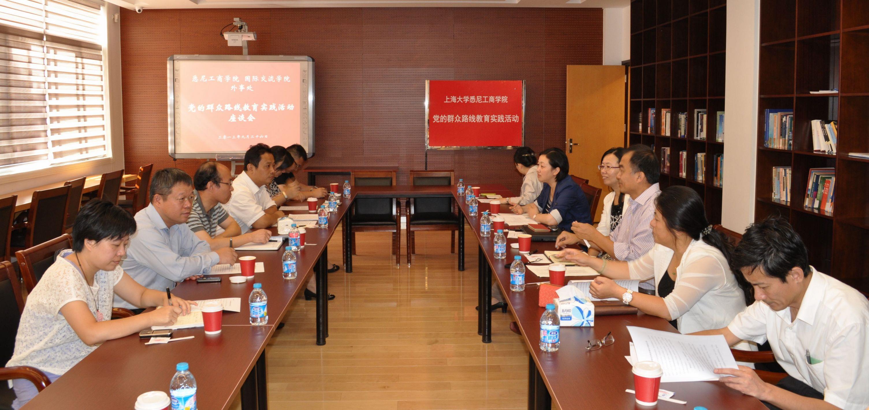 9月26日上午,悉尼工商学院在嘉定校区文德楼二楼国际交流中心召开党的群众路线教育实践活动座谈会。beat365英国官方网站党的群众路线教育实践活动领导小组组员、beat365英国官方网站党委常委、外事处处长、悉尼工商学院院长龚思怡,实践活动督导组组员、材料科学与工程学院党委书记朱明原,国际交流学院院长姚喜明、党总支书记李坚、副院长杨静、院长助理朱焱炜、招生办公室主任黄浩,中欧工程技术学院副院长兼院办主任张建华、外事处副处长倪兰等应邀出席。悉尼工商学院书记李双、副书记滕云、副院长马锦华、副院长吕康娟、院办主任徐晓红参加座谈会。