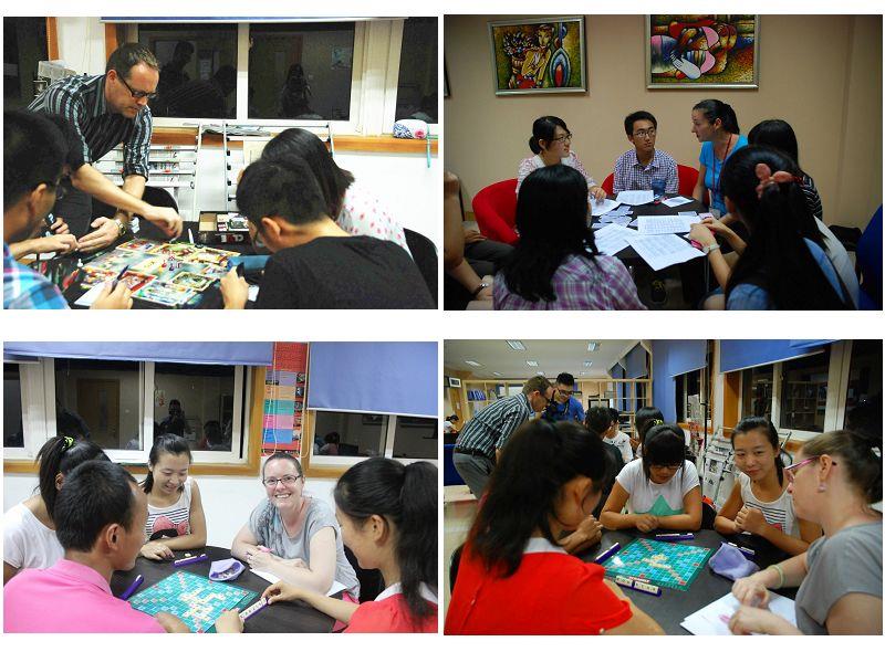活动中,大家分成四个组轮流参与每位外教所主持的游戏:有西方流行的英语图版游戏Scrabble,纸牌游戏Uno,以及Brainstorm等。同学们积极地参与每个游戏,时而仔细聆听,时而热烈讨论,场面十分活跃。值得一提的是游戏Card Question,大家每抽到一张扑克都对应着一个问题,抽到的同学须向组里的每一个人提问并记住答案,最后进行汇总。所有游戏均需要用英语进行交流。同学们表示,形式多样的英语游戏能够增强与外教的沟通能力,提高自身的英语口语水平,发掘思维潜力。