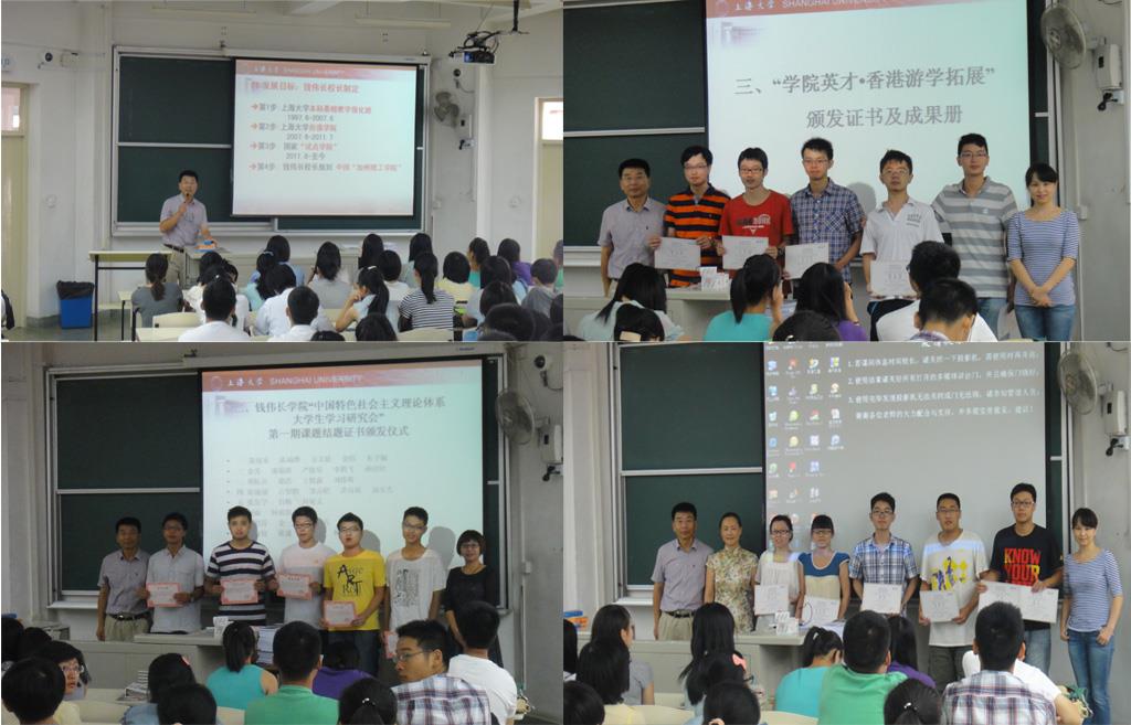 接着,在全场热烈的掌声中,顾传青、阮杜鹃老师为钱伟长学院“中国特色社会主义理论体系大学生学习研究会”第一批成功通过答辩的八组同学颁发结题证书。李颖洁、徐晓夏老师为“学院英才·香港游学拓展”活动的全体同学颁发证书。同学们纷纷发表感想,认为学院贯彻钱校长“学生成才在课外”的教育理念,搭建各种课外培养平台,使大家在各种活动中得到了锻炼,培养了自信心。至此,钱伟长学院2013学年秋季学期主题首日教育圆满落幕。