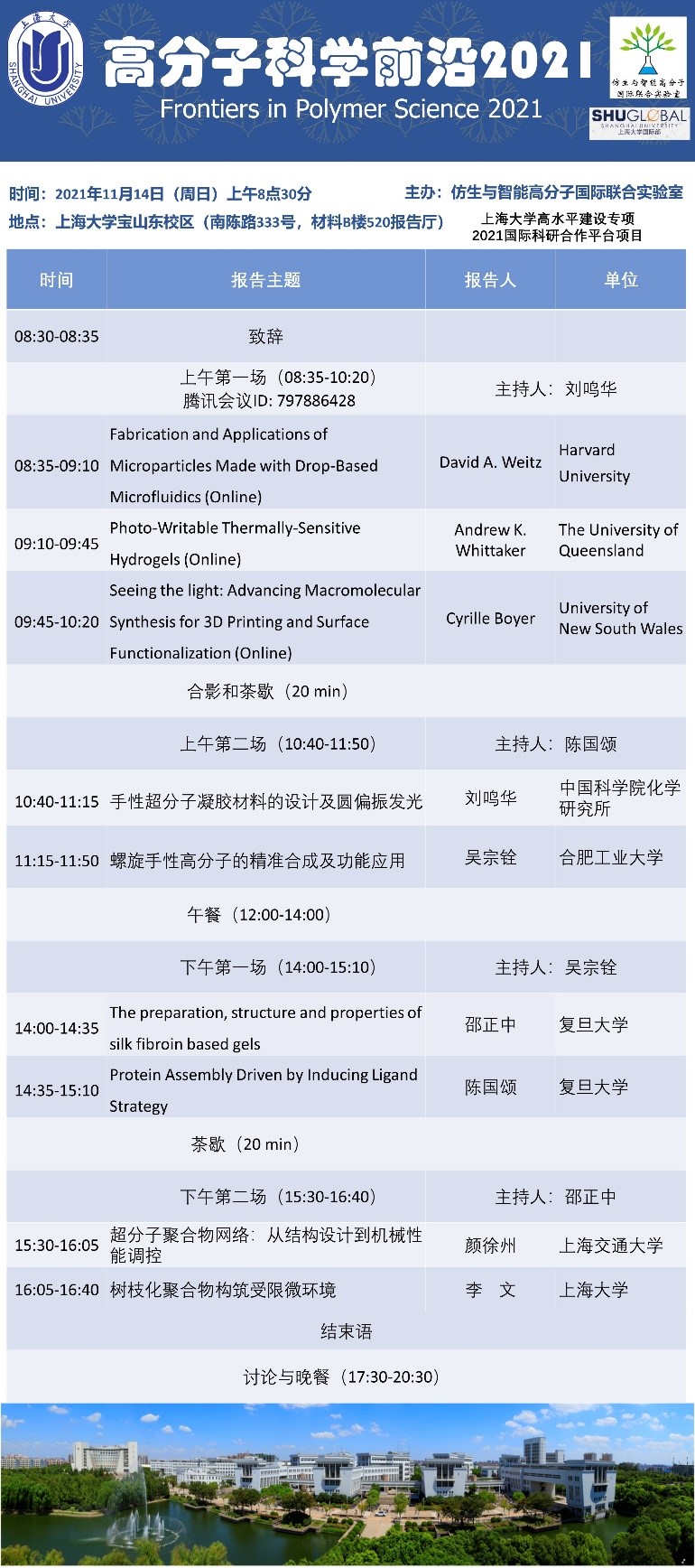 报告简介:材料学院仿生与智能高分子国际联合实验室举办高分子科学前沿论坛。本次论坛邀请了来自美国哈佛大学、澳大利亚昆士兰大学、澳大利亚新南威尔士大学、中科院化学所、复旦大学、上海交通大学等高校的多位国际知名学者,围绕高分子化学和材料领域的前沿研究进行学术报告和交流讨论,详情请见以下会议议程。