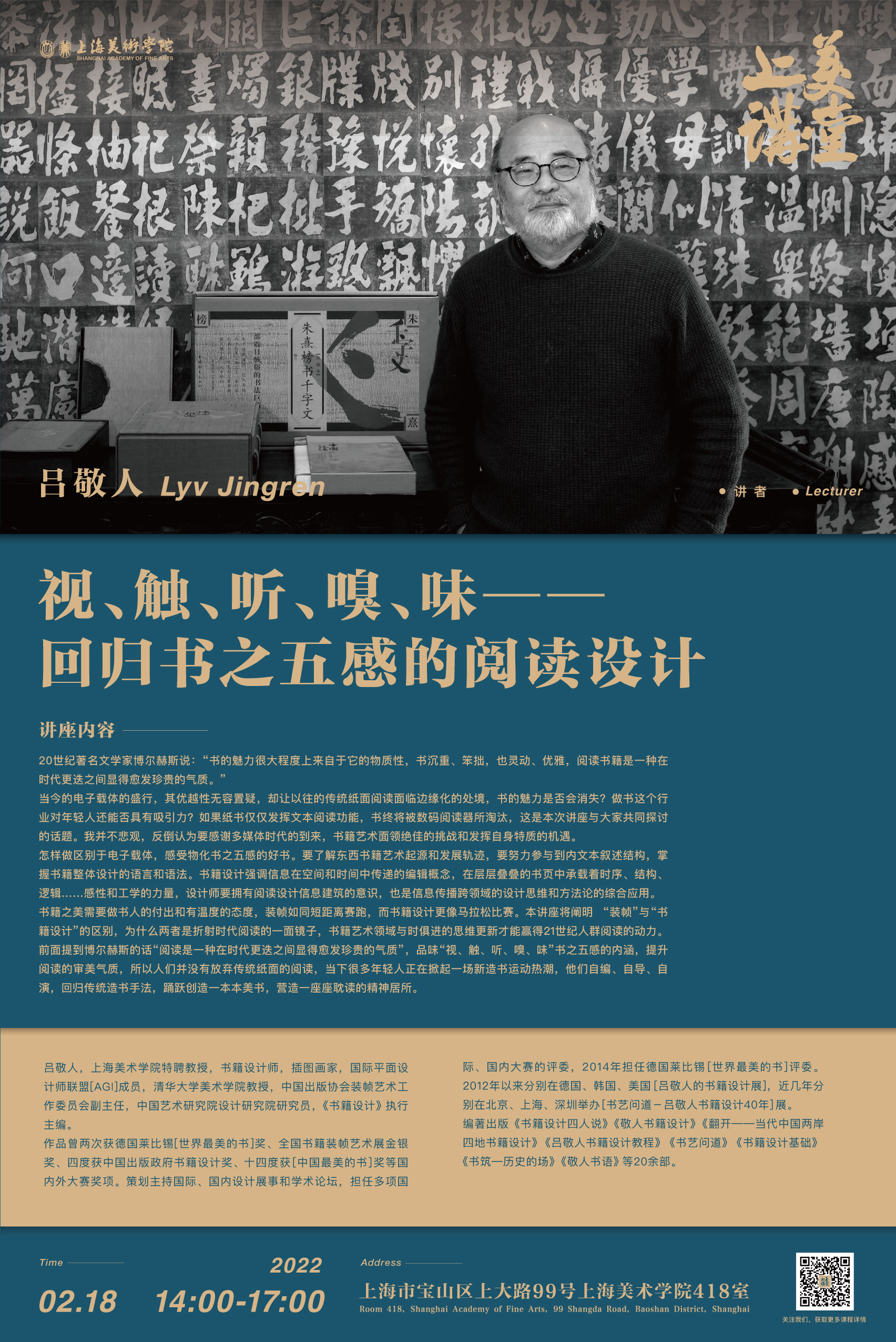 个人简介:吕敬人,1947年生于上海。书籍设计大师、插图设计大师、视觉艺术家,AGI国际平面设计协会会员。师从神户艺术工科大学院杉浦康平教授,现任清华大学美术学院教授,beat365英国官方网站上海美术学院特聘教授。中国出版工作者协会书籍装帧艺术委员会副主任,全国书籍装帧艺术委员会副主任、中央各部门出版社装帧艺术委员会主任,中国美术家协会插图装帧艺术委员会委员。
